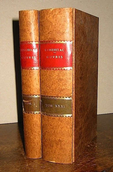 12mo (cm. 18), 31 Volumi. Opera completa. Ottima legatura recente in cartonato con titolo oro e numerazione su doppi tasselli in pelle rossa e verde. Conservate all’interno le brossure mute coeve. Esemplare in barbe. Ingialliture della carta. Noto esponente, tra i maggiori, del movimento illuministico ebbe tra i suoi principali interessi i problemi della conoscenza sviluppati nelle sue opere più note, come l’Essai sur l’origine des connoissances humaines’ (1746), il ‘Traité de sensations (1751) e il ‘Traité des systemes’ (1749), tutte presenti in questa edizione insieme al ‘Cours d’étude’ (1775), frutto dell’insegnamento al Delfino di Parma nel quale viene messo in gran rilievo il valore formativo attribuito alla storia e alla logica.