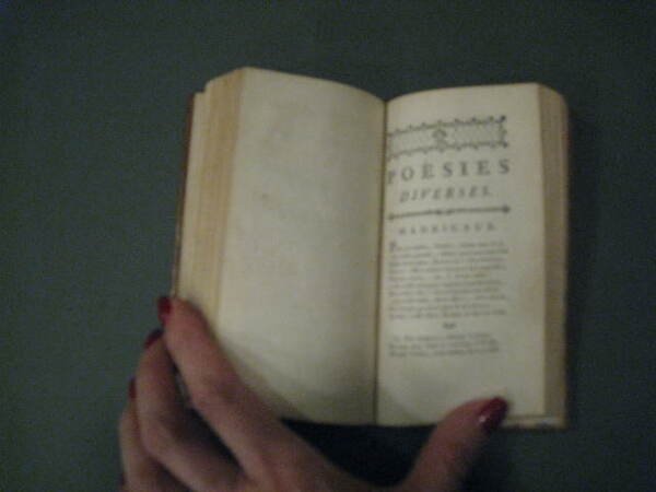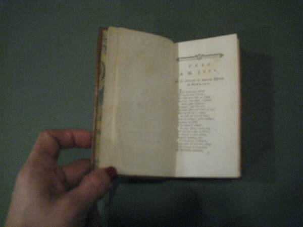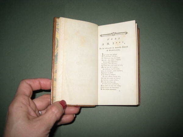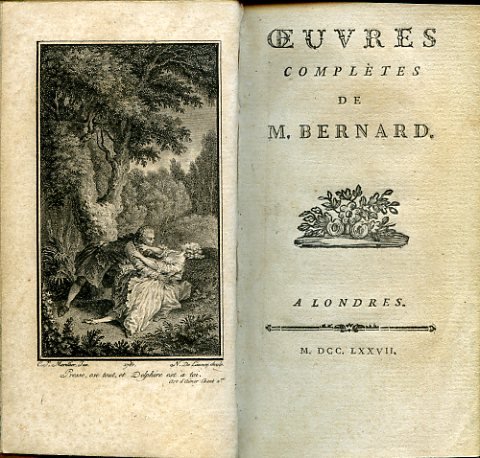 In-24°, pp. (4), 204, legatura coeva p. pelle marrone marmoreggiata con titolo, filetti e decori dorati al dorso. Sguardie marmorizzate, fregio floreale al titolo. Antiporta incisa su rame da De Launay da invenzione di Marillier. Fregi tipografici in xilografia. Ottimo esemplare. Graziosa edizioncina che raccoglie in un unico volume l'Art d'aimer' e le opere complete del Bernard, tra cui la tragedia 'Castor et Pollux'. Il Bernard, nato a Grenoble nel 1710, morto nel 1775, fu poeta e librettista della schiera dei 'petits poètes' settecenteschi (Louis Racine, St. Lambert, Gresset, etc.) e del 'Caveau' di Crébillon figlio. Scrisse rime galeotte (anche pronube degli amori della Pompadour), tragedie liriche ('Castor et Pollux', fu musicata da Rameau), madrigali, commedie e balletti. Le sue opere complete apparvero in due voll. nel 1803 curate da F. Fayolles. Voltaire apprezzò molto 'L'Art d'Aimer' e la definì, con eccesso d'entusiasmo, 'ouvrage unique' quando ancora circolava manoscritta. Pubblicata solo un trentennio dopo all'insaputa del Bernard, già prossimo alla morte, l'opera fu oggetto di dure critiche e per la licenziosità del contenuto e per l'artificiosità dello stile. Tuttavia un certo successo arrise a questo poema erotico ancora in età romantica, quando Dumanoir e Clairville ne trassero un 'vaudeville' rappresentato a Parigi nel 1846. Cohen-De Ricci, 53: 'Une charmante figure par Marillier, gravée par Delaunay, dans le genre voluptueux'. Cfr. Gay-Lemonnyer, I, 277 e Graesse, I, 343.