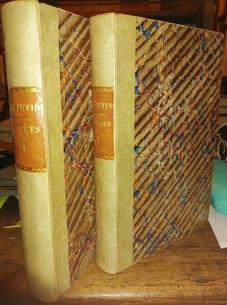 In-8 (20,5 cm) 2 voll XIX (1) 364; 417 (1). Vignetta incisa ai frontespizi. Elegane legatura in mezza pergamena, con piatti rivestiti di carta decorata. Introduzione di Nodier Charles (1780-1844): romanziere, saggista, giornalista. Nato a Besançon nel 1780, morto a Parigi nel 1844. Lamartine d'Alphonse (1790-1869): poeta, scrittore e uomo politico. Fu nominato membro de L'Académie française nel 1829. Fu membro del governo provvisorio e Ministro degli affari esteri dal 1848. Nato a Mâcon e morto a Parigi. Contiene: Méditations poétiques, La mort de Socrate, Epitres et poésies diverses. Contiene: Nouvelle méditations poétiques, Le dernier chant du pélerinage d'Harold, Le chant du sacre. French language. Lingua francese