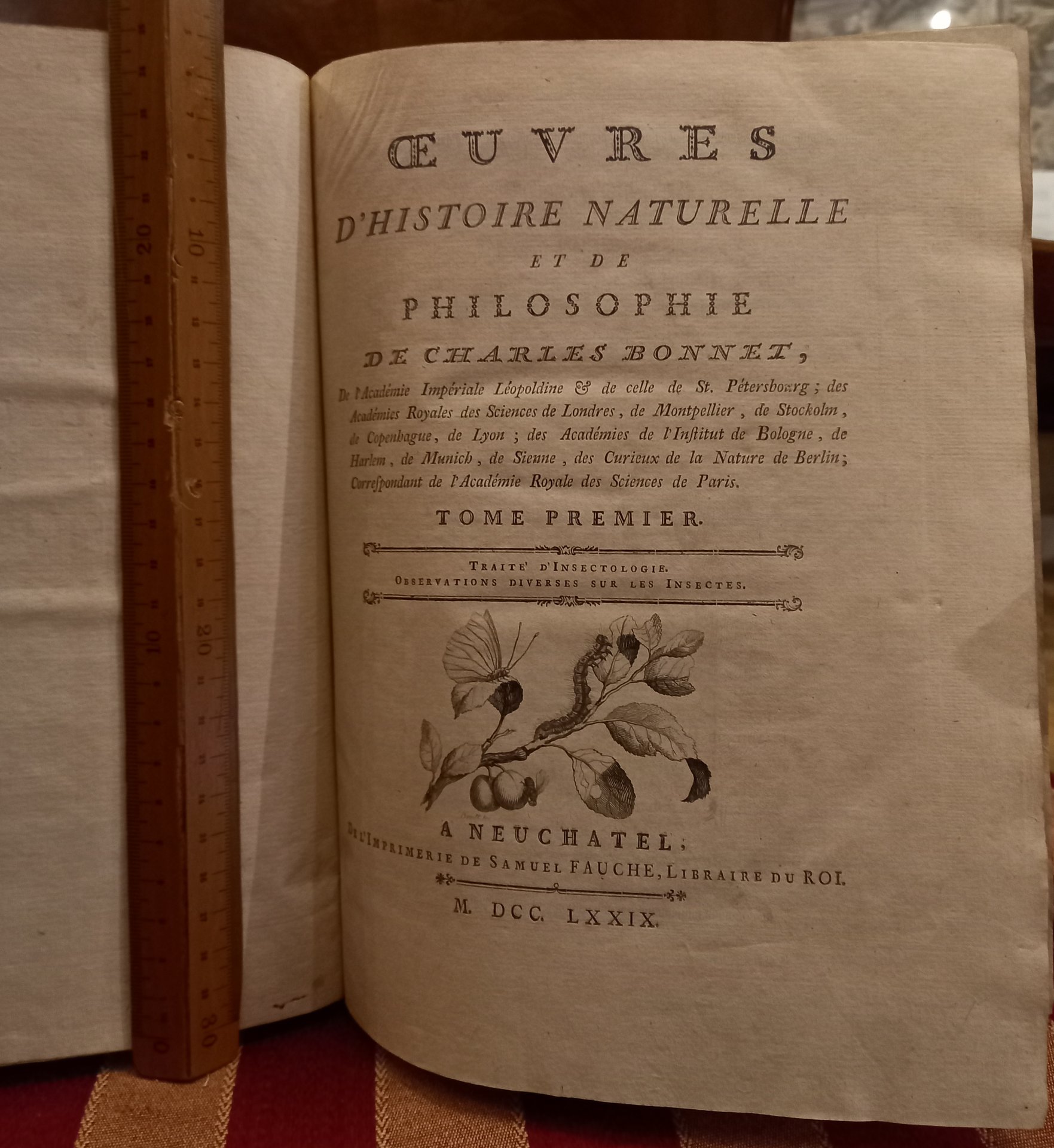 In-4 (16,5 cm) 8 volumi in 10 tomi. (4) XXXI (1) (2) c. (tabelle ripiegata) 574 (2) (6) c. (tavole illustrate ripiegate) VI c. (tavole illustrate ripiegate) (2) c. (tavole illustrate ripiegate) al frontespizio vignetta calcografica con insetti su un ramo, sottoscritta da Bradt; (4) II 2 c. (tav. ripiegate illustrate) 524 XXXII c. (tav. ripiegate illustrate) (2) vignetta calcografica al frontespizio con pianta in un vaso e fregio xilografico; (4) XVI 579 (1) 2 vignetta calcografica di un uomo, una donna, un lattante e un bambino in un granaio; (4) XX 396 vignetta calcografica sul frontespizio rappresentante raggi del sole da dietro una nuvola illuminano la Terra e in testatina un uomo, animali, insetti, piante, conchiglie e minerali su una scala; (4) 502 (2) vignetta calcografica sul frontespizio con un albero con nido e testatina con vignetta calcografica con paesaggio naturale con animali; (4) IV 395 (1) II VIII c. (di tav. ripiegate illustrate) al frontespizio vignetta calcografica con alveare e in testatina giardino con personaggi; (4) 412 sul frontespizio vignetta calcografica con Mercurio e in testatina personaggio seduto che detta una lettera; (8) XXIV 427 (1) al frontespizio vignetta calcografica con cherubino che suona e testatina sopra la dedicatoria con Stemma calcografico di Federico V re di Danimarca e Norvegia, fra due figure allegoriche, altra testatina con vignetta con fanciulla che offre un fiore a un ragazzo in una radura; (4) VIII 698 al frontespizio vignetta calcografica con figura evanescente sospesa sul basamento di un monumento e in testatina rovine archeologiche; XIV (2) 509 vignetta calcografica al frontespizio condonna con fanciullo in un medaglione e testatina con vignetta calcografica raffigurante una casa di campagna con paesaggio naturale. Elegante legatura coeva in mezza pelle, piatti cartonati rivestiti di carta marmorizzata. Dorso con tassello in pelle, fregi e caratteri dorati.Tagli spruzzati di rosso. Caratteri dorati al dorso. Carta con filigrana setecentesca a 3 lune, compresi i contropiatti. Alcune pagine e alcune tavole molto arrossate. Al tomo sixieme non è stata inserita la carta 423-424 dell'indice. Numerosi finalini. Tutti i frontespizi e le testatine sono sottoscritti da Bradt. Alcune delle 57 tavole calcografiche sono sottoscritte R.B., altre Billé sculp, con data 1778. Titolo degli occhietti: Collection complete des œuvres de Charles Bonnet.In-4 (16.5 cm) 8 volumes in 10 volumes. (4) XXXI (1) (2) c. (folded tables) 574 (2) (6) c. (folded illustrated plates) VI c. (illustrated plates folded) (2) c. (illustrated plates folded) on the title page, engraving vignette with insects on a branch, signed by Bradt; (4) II 2 c. (illustrated folded plates) 524 XXXII c. (illustrated folded plates) (2) engraving vignette on the title page with plant in a vase and woodcut frieze; (4) XVI 579 (1) 2 engraving vignette of a man, a woman, an infant and a child in a barn; (4) XX 396 engraving vignette on the title page representing the sun's rays illuminating the Earth from behind a cloud and in the header a man, animals, insects, plants, shells and minerals on a ladder; (4) 502 (2) engraving vignette on the title page with a tree with a nest and header with engraving vignette with a natural landscape with animals; (4) IV 395 (1) II VIII c. (of illustrated folded plates) on the frontispiece engraving vignette with beehive and on the header garden with characters; (4) 412 on the title page, engraving vignette with Mercury and in the header a seated character dictating a letter; (8) XXIV 427 (1) on the frontispiece, engraving vignette with a playing cherub and header above the dedicatory with engraving coat of arms of Frederick V, king of Denmark and Norway, between two allegorical figures, another header with vignette with a girl offering a flower to a boy in a clearing; (4) VIII 698 on the title page, engraving vignette with an evanescent figure suspended on the base of a monument and archaeological ruins at the head; XIV (2) 509 engraving vignette on the frontispiece showing a woman with child in a medallion and header with engraving vignette depicting a country house with a natural landscape. Elegant contemporary half-leather binding, cardboard plates covered with marbled paper. Spine with leather gusset, golden decorations and characters. Cuts sprayed in red. Golden lettering on the spine. Paper with 18th-century 3-moon watermark, including cover plates. Some pages and some tables very red. Index card 423-424 was not inserted in the sixeme tome. Numerous ends. All title pages and mastheads are signed by Bradt. Some of the 57 intaglio plates are signed R.B., others Billé sculp, with the date 1778. Title of the small eyes: Collection complete des œuvres de Charles Bonnet. French language. Lingua francese