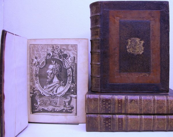 A la Haye chez P. Gosse & J. Neaulme, 1731. 4 volumes in/4 reliure plein veau du temps, dos à nerfs à décor doré, pièces de titre havane, plat avec décor à froid et blason central doré (partiellement effacé), tranches rouges, illustrations gravées : frontispice (Debrie), vignettes (A. Vander laan), bandeaux (Filloeul), lettrines historiées, texte entouré de frises ; tome 1 : 24 ff., 592 p. - tome 2 : 24 ff., 584 p. - tome 3 : 8 ff., 572 p. - tome 4 : 24 ff., 572 p., 1 f. Exemplaire en excellent état, rares rousseurs et légère oxydation. 4 books 4 to in full contemporary calf, ribbeds spine with labels & gilt fleuron, two colours calf on boards with blind stamped decoration and central gilt arms (partially erased), red edges, frontispiece by Debrie, vignettes by A. Vander Laan, head-pieces by Filloeul, initial letters, framed texts. Vol. 1 : [24], 592 p. - vol.2 : [24], 584 p. - vol. 3 : [8], 572 p. - vol. 4 : [24], 572 p., [1]. Very fine copy with only one pagination error in vol. 4 (111 instead of 211) ; rare foxing and slight browning. C'est sous l'égide de son père, Jean Marot, et de Lemaire de Belges, que C. Marot fait ses débuts de poète avec "Le temple de Cupido" (1514), recueil dans le prolongement de la grande rhétorique et de la poésie médiévale. Entré au service de Marguerite d'Angoulême dès 1519, et ensuite acquis à l'évangélisme du groupe de Meaux. Dénoncé et emprisonné au Châtelet pour avoir mangé du lard en Carême, il compose alors l'Epîste à son ami Lyon et une satire de la justice (L'enfer) qui rappelle Villon. Valet de chambre du roi, chroniqueur, brillant et insolent, il donne en 1532 L'adolescence Clémentine ; Le livre auquel il a apporté un grand soin, connaît un immense succès et fait de son auteur l'un des plus célèbres poètes de son temps.