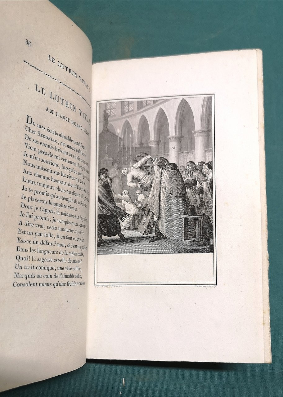 >2 voll. in-8, pp. LXXII, 383, con 1 ritratto in antiporta,  5 tavole incise all'acquaforte, 1 vignetta; pp. 444; Le Parrain Magnifique, con frontespizio proprio (datato 1810): pp. VIII, 120, (2), con 3 tavole incise all'aquaforte. Legatura coeva in m. pelle, titolo e fregi floreali in oro al dorso. Prima edizione postuma de "Le Parrain Magnifique". Magnifica edizione, arricchita dalle 9 tavole di Simonet e Ghendt, in questo esemplare tutte in doppio stato. "Cette édition est la plus complète et la meilleure qu'on ait encore de ce poëte." (Brunet).  Ottimo esemplare, fresco, a pieni margini, in barbe, con tavole in doppio stato; qualche lieve arrossatura.  Cohen, 463.