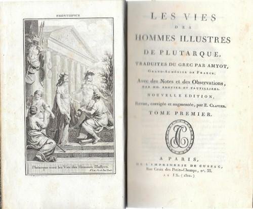 in 8°, pp. 12.000 circa ; p/pelle coeva verde, tit. e fregi in oro e a secco al ds., cornici in oro e a secco ai piatti, sguardie e tagli marmorizzati, nastri segnalibri; "Traduit du grec par Amyot, Grand-Aumonier de France, Avec des Notes et des Observations, par MM. Brotier et Vauvilliers, nouvelle édition revue, corrigée et augmentée, par E. Clavier". Opera ill. da 22 incisioni in taglio dolce f.t. di Marechal, J.M. Moreau, A. Borel, De Longueil, C.P. Marillier, Mirys, e 131 medaglioni n.t. accuratamente tratti da medaglie antiche.; ex libris del Comte de Lanet au Chateau de La Garde Giron, piccole mancanze alle leg. del 2° e del 5° vol., e qc. lieve spellatura ma ottimi voll. freschi e con ampi margini; Graesse V, p. 364. 599/23