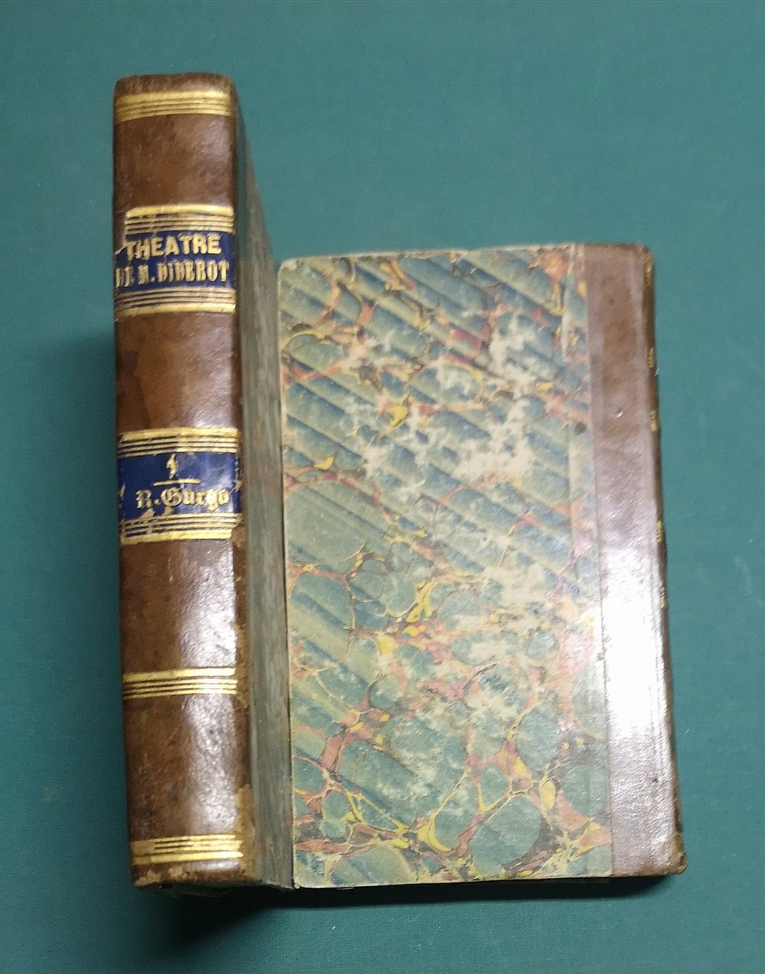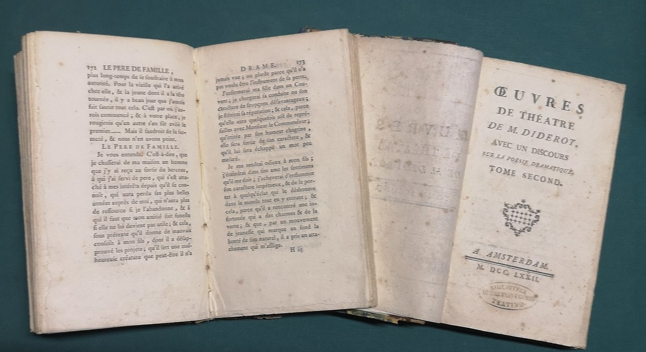 >2 vol. in-12, pp. (4), 438; (4), 387; leg. del tempo m. pelle, tit. e filetti oro ai dorsi. Dedica dell'autore ''A Son Altesse Sérénissime Madame la princesse de Nassau-Saarbruck''. Contraffazione contemporanea della terza edizione (Amsterdam, chez Marc-Michel Rey) delle opere teatrali di Diderot, che erano apparse per la prima volta ad Amsterdam nel 1759. Vi si trovano i due drammi, entrambi in cinque atti in prosa, ''Le père de famille'' e ''Le fils naturel'', seguiti dall'importante saggio ''De la poésie dramatique'' e dalle ''Observations tirées de l'Observateur littéraire'', compilate da anonimo autore sulle opere citate. Esempl. discreto. Tchemerzine IV, 449