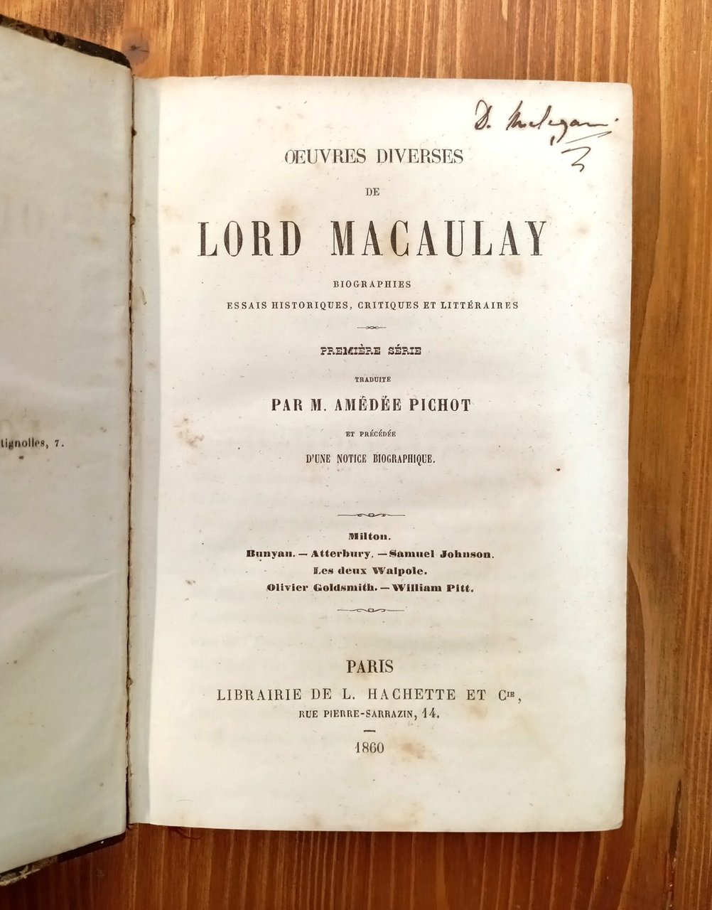 Oeuvres diverses de Lord Macaulay. Première série : Milton, Bunyan, Atterbury, Samuel Johnson, Les deux Walpole, Olivier Goldsmith, William Pitt
