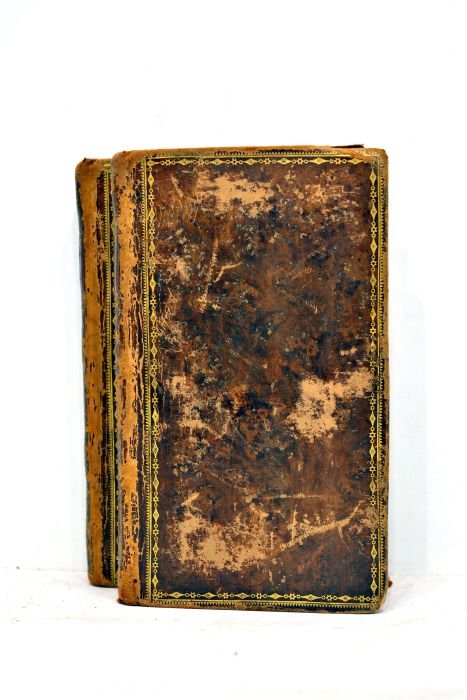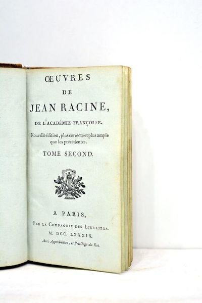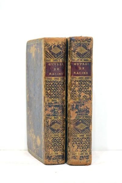 2 volumes. Tomes 2 et 3. 365 pages. + 370 pages. (15x9cm). Pleine basane. Dos lisse orné. Pièce de titre maroquin rouge. Encadrements dorés sur les plats. Filet doré sur les coupes. Gardes de papier marbré. Reliure très frottée et usagée. Epidermures importantes sur le dos et sur les plats. Charnières fendues. Coupes élimées. Coins émoussés. Papier intérieur bleuâtre. Infimes rousseurs. Trace de brulure avec perte de quelques mots aux pages 22--23 (tome 2). Par ailleurs, intérieur satisfaisant. Petit ensemble de 2 volumes parés d'une reliure uniforme au dos richement décoré qui mérite une grande restauration. Le tome 2 contient ces pièces théâtrales: Bérénice. Mithridate. Iphigénie. Phédre. Le tome 3 inclut: Esther, tragédie tirée de l'Ecriture Sainte. Athalie. Oeuvres diverses en vers et en prose.