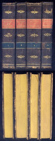 Paris, Beaucé et Audin, Libraires, Imprimerie de Demonville, 1817. Cuatro tomos en 4to.; 2 hs., XVI pp., 2 hs., 570 pp., 8 pp. + 2 hs., 508 pp. + 2 hs., 756 pp. + 2 hs., 756 pp. Encuadernación uniforme de la época en piel con tejuelos.