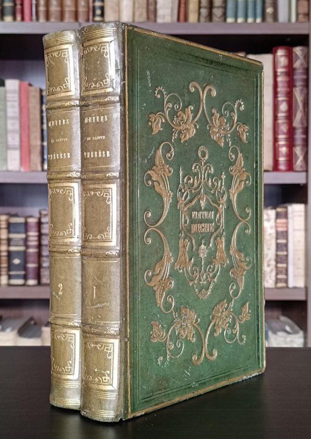 2 volumi (di 4) in-8° (cm. 26,7), <span style="font-size: 13.333333px;">pp. [4] 732, 702 in stato molto buono (alcune fioriture sparse). Be</span>lle e solide legature coeve in vitellino verde con piatti inquadrati da una doppia cornice in oro e a secco, al centro dei quadranti grandi fregi floreali che racchiudono a loro volta l'elegante placca editoriale; dorsi con titolo, filetti ornati in oro ai nervi e cornici con motivi decorativi interni ai comparti sempre in oro (lievi tracce d'uso); tagli dorati; risguardi marmorizzati. Graziosa edizione con 1 ritratto della Santa inciso in rame da Auguste Thomas Marie Blanchard e 1 facsimile di manoscritto all'antiporta fuori testo del volume primo. Opera aperta dall'agiografia di Villefore e dalla Bolla di Canonizzazione di Gregorio XV, a cui segue l'autobiografia, le meditazioni, il Cammino di perfezione, il Castello dell'anima, le Lettere inedite, ecc. Testo interamente inquadrato da graziose cornici decorative e con finalini incisi in rame. Esemplare molto buono.