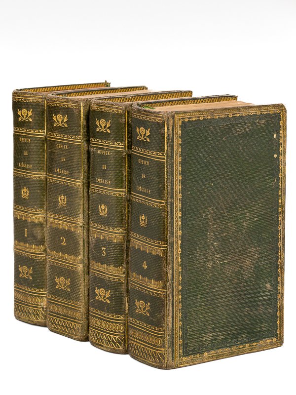 A l'Usage de son Diocèse, Selon les nouveaux Missel, Rituel & Bréviaire, 4 vol. petit in-8 reliure de l'époque plein maroquin vert à grains long, filets dorés d'encadrement en plat, coupes et chasses ornées, toutes tranches dorées, Chez Veuve Trenchard Behourt, A Rouen, 1815, 806 pp. et 8 ff. n. ch. ; 804 pp. et 8 ff. n. ch. ; 782 pp. et 9 ff. n. ch. ; 834 pp. et 9 ff. n. ch. Joli exemplaire en belle reliure d'époque, de cet office peu commun, avec le texte latin intégralement traduit en français en regard (texte en colonnes). Bon état (plats un peu frottés, usures avec petites piq. de vers à un mors, qq. rouss., bon exemplaire par ailleurs, avec quelques belles images pieuses d'époque ou lég. postérieures).