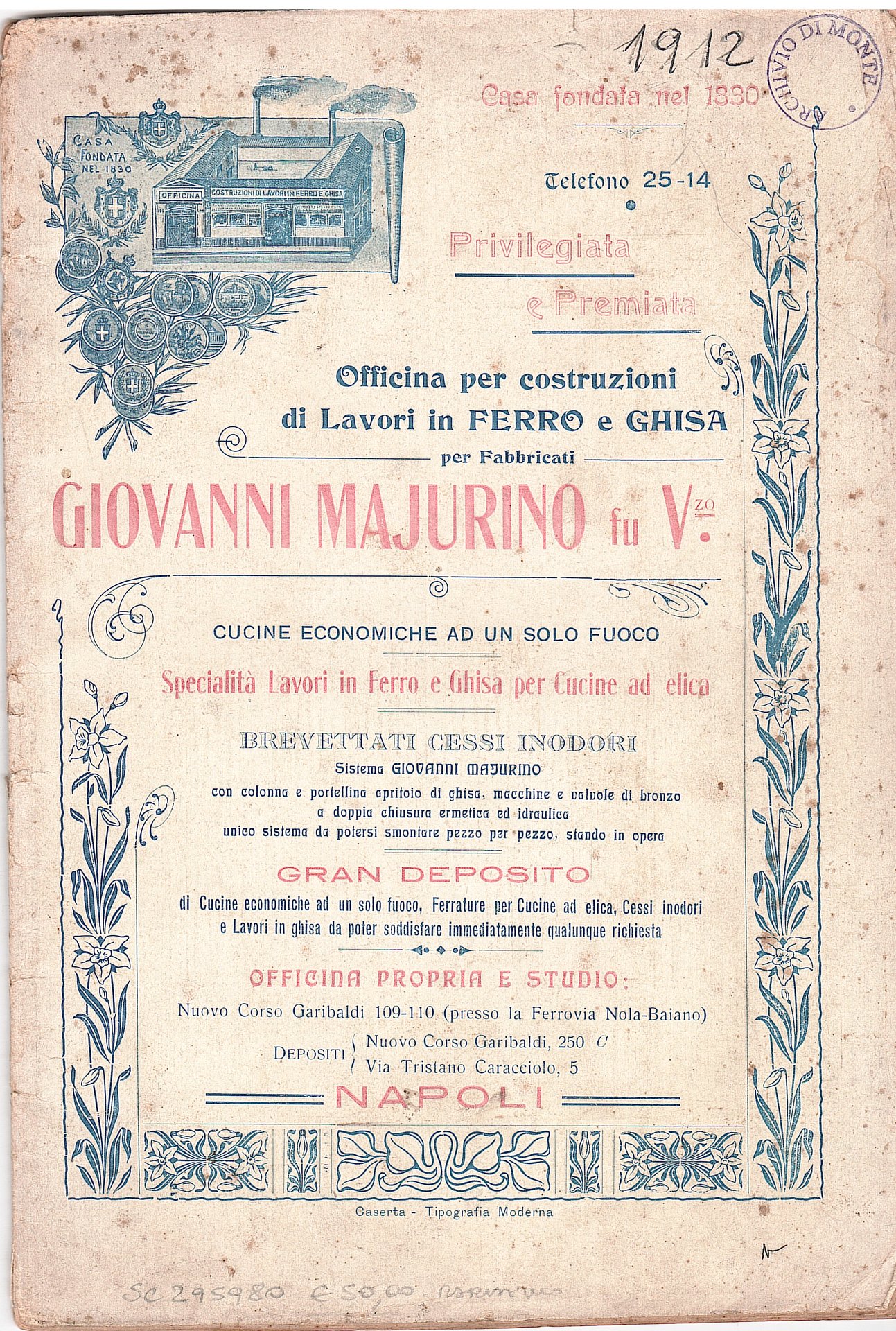 19X28, brossura, Caserta, Tipografia moderna, 1912, 30 pp, ill. b/n, catalogo fabbrica di costruzioni in ghisa e ferro con disegni di prodotti per fabbricati della fabbrica napoletana Giovanni Majurino. rarissimo catalogo ricco di disegni di produzione in ferro dell'epoca per decorazioni, balconi, cucine, bagni...molto interessante per il design dell'epoca. timbro di appartenenza in copertina