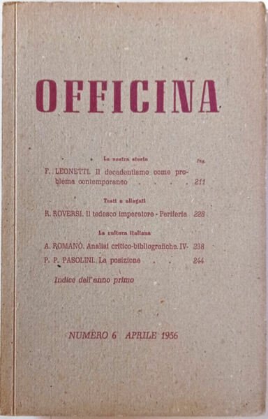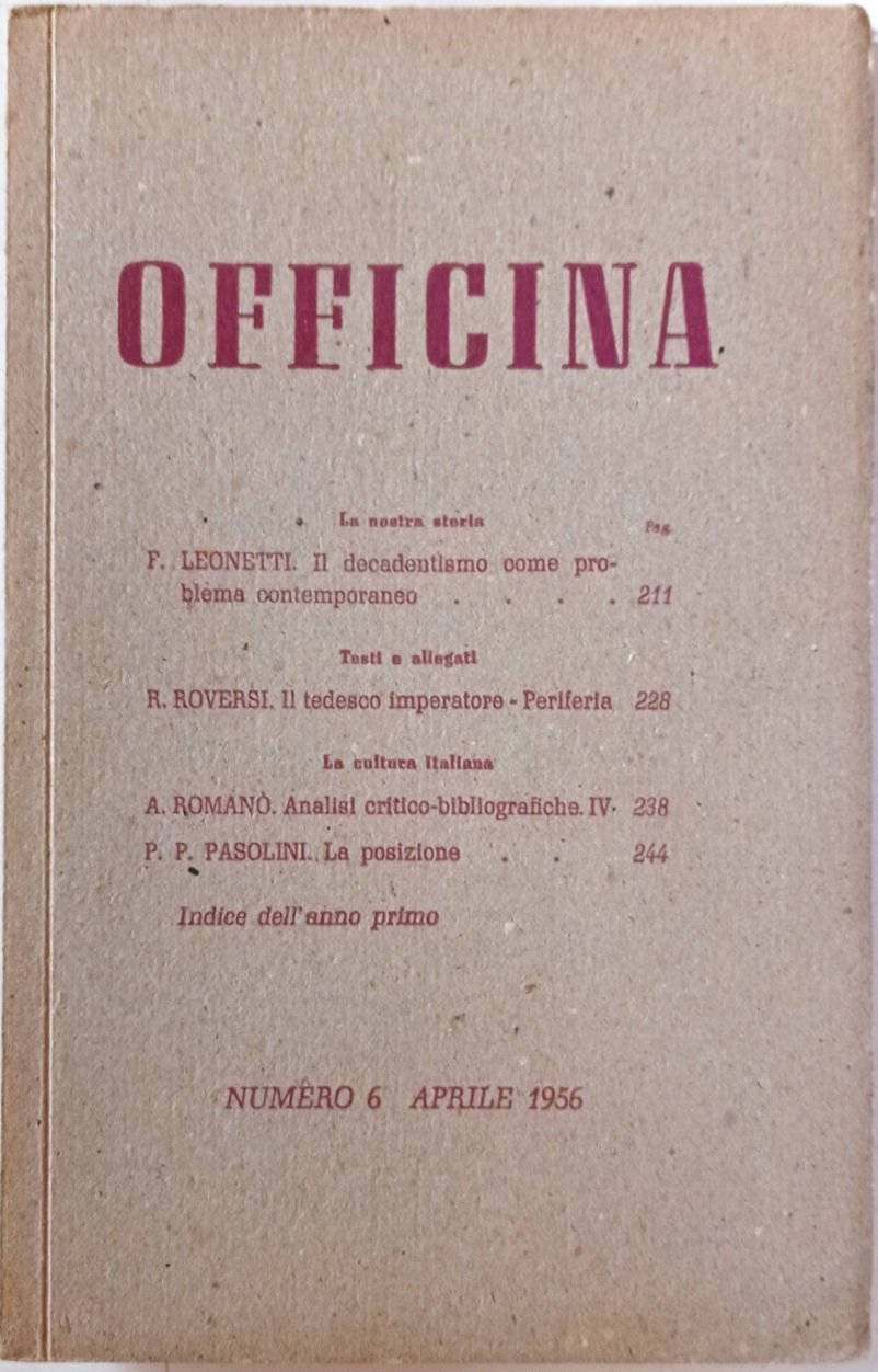 In 16, p. 209-252, br. orig. a fogli chiusi. - Testi di P. P. Pasolini, R. Roversi, F. Leonetti.