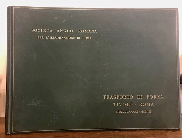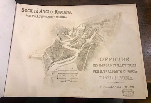 Folio formato album (cm. 33x46), 32 pp. Una carta topografica a colori su doppia pagina (’Officina elettrica in Tivoli e sue derivazioni di acqua. Topografia generale’) e 56 tavole fotografiche e tecniche f.t. Legatura editoriale in piena tela verde con titoli in oro al piatto anteriore. Tagli rossi. Esemplare in eccellente stato di conservazione. Raro. Provenienza: collezione Moretti, Roma (timbretto ex libris al frontespizio).