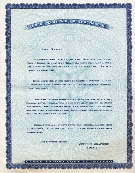 Officine grafiche Coen & C. Copia del Memorandum dello Studio Notarile Guasti di Milano. Undicesima edizione. Carta filigranata.