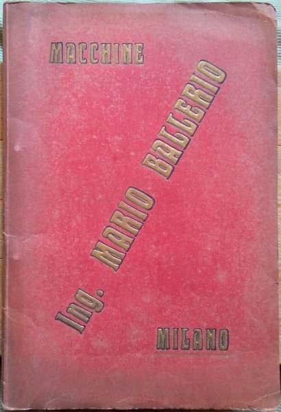 In-4° (29,5 x 18,3 cm), pp. non numerate 32, copertina editoriale. Normali segni d'uso e del tempo alla copertina anteriore, la sola che la pubblicazione presenta. Con dodici illustrazioni fotografiche in bianco e nero, a piena pagina, nel testo. Qualche piccola, leggera traccia d'umido, per il resto, in buono stato. Su carta lucida. Il catalogo si compone di sedici schede perforate, con due fori, nel loro bordo interno, tenute insieme da due linguette metalliche, originali, applicate nella parte interna della copertina, inserite in detti fori e ripiegate a bloccare l'insieme. Ciascuna scheda riporta al recto l'immagine dell'articolo pubblicizzato ed è bianca al verso. Le ultime due schede riportano le descrizioni, i prezzi, e le condizioni di vendita dei macchinari. Bella pubblicazione pubblicitaria illustrata relativa a macchine prodotte dalla ditta Ing. Mario Ballerio di Milano. Dettaglio degli articoli pubblicizzati e raffigurati: 1) Pompa autodifferenziale a forte pressione per presse idrauliche. 2) Pompa autodifferenziale a forte pressione di grande portata. 3) Pompa autodifferenziale a tre cilindri (per medie e grandi portate). 4) Pompa autodifferenziale a tre cilindri (di grande velocità - prevalenza fino a 120 metri). 5) Pompa autodifferenziale a un cilindro, a grande velocità, piccole portate - prevalenza fino a 120 metri. 6) Pompa rotativa per medie e grandi portate - prevalenza fino a 35 metri. 7) Pompa rotativa tipo per liquidi grassi. 8) Impianto di presse idrauliche per formare pacchi di rottame di ferro, rame, ottone. 9) Impianto di presse idrauliche per formare pacchi di rottame di ferro, rame, ottone (bis). 10) Pressa idraulica a grande bocca di carico per formare pacchi di rottame ferro. 11) Grande pressa idraulica a formare pacchi di rottame ingombrante. 12) Pressa idraulica tipo speciale per drizzare lamiere (coperte da pacchi). Titolo completo: Officine per la costruzione di macchine brevettate Ing. Mario Ballerio, Via Curtatone, 15 - Milano. Specialità: Pompe per alte pressioni - Presse idrauliche - Pompe industriali - Aspiratori. Compressori di gaz - Robinetteria comune - Robinetteria per alta pressione. Impianti speciali per formare pacchi, masselli di rottame, bricchette di tornitura di ghisa, ferro, acciaio, ottone, bronzo ecc. Impianti di centrali idrauliche.