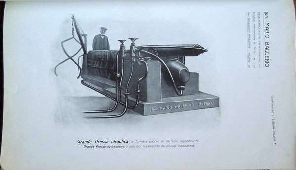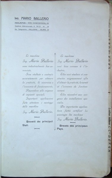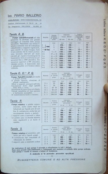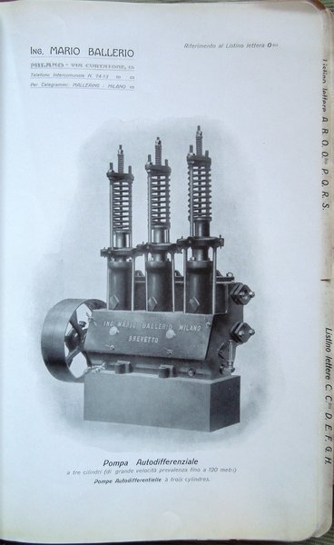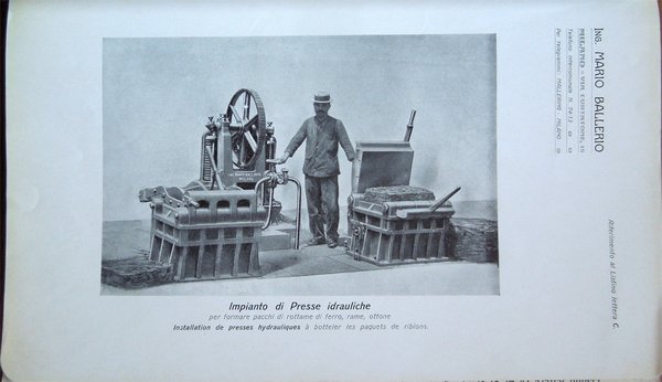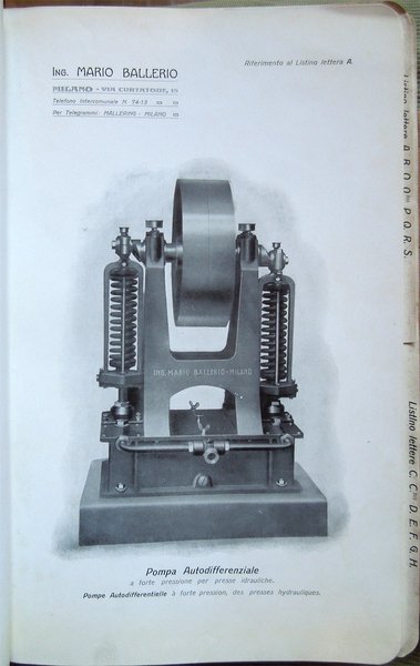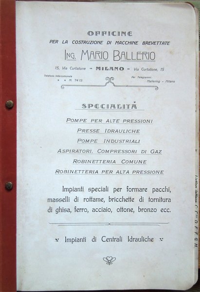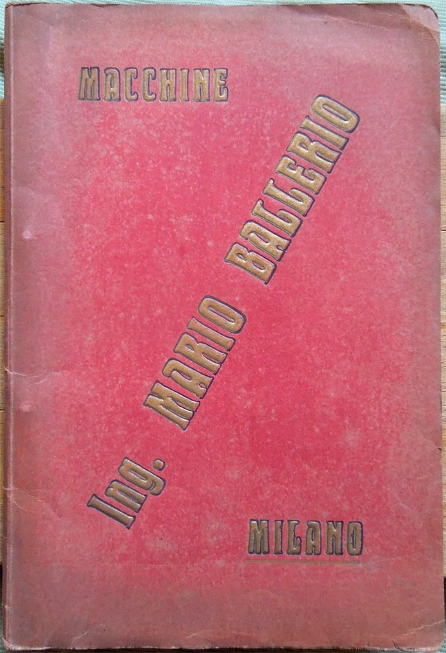 Officine per la costruzione di macchine brevettate Ing. Mario Ballerio . Specialità: Pompe per alte pressioni - Presse idrauliche - Pompe industriali - Aspiratori. Compressori di gaz - Robinetteria comune - Robinetteria per alta pressione .