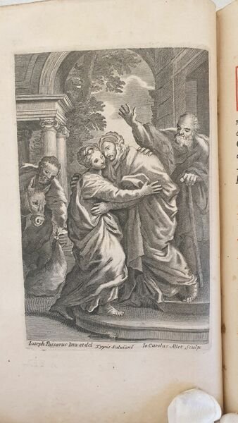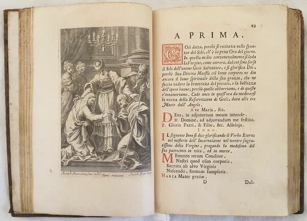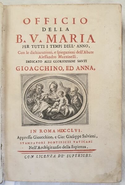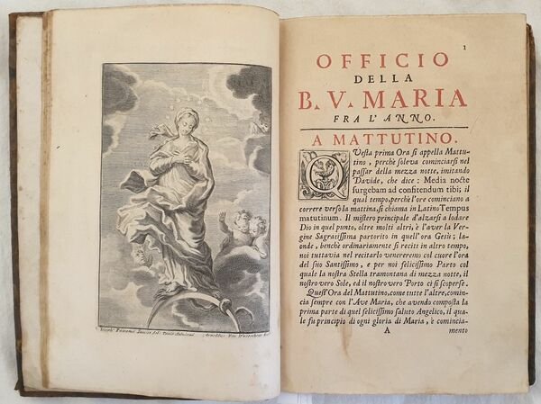 Finissima edizione illustrata del 1756 di questo Officio della Beata Vergine Maria dell'Abate Alessandro Mazzinelli.<BR><BR>All'interno: Tavola temporale delle feste mobili, Orazione da recitarsi avanti il Divino Uffizio, Officio della Beata Vergine Maria.<BR><BR>Alla fine con frontespizio proprio: Officio dei morti dello Spirito Santo e della Santa Croce. All'interno Officio dello Spirito Santo, Inno per impetrar la grazia dello Spirito Santo, Esercizio per la mattina, Orazione per chiedere a Dio il perdono dei peccati, Orazioni varie, Orazioni di San Francesco di Sales per le donne partorienti, Litanie della B. V. Maria, Modo di dare il Sacramento del Battesimo alle creature di nascita poste in pericolo di vita.<BR><BR>Il testo è impreziosito da 13 finissime incisioni fuori testo di diversi incisori come Arnold van Westerhout (1651-1725), Geronimo Frezza, Carlo Allet su disegno del pittore romano Giuseppe Passeri (1654-1714). Le incisioni mostrano diverse scene bibliche come Natività, matrimonio, parto ecc.<BR><BR>Arnold Van Westerhout nato ad Anversa, apprendista nella bottega di Alexandre Voguier venne ammesso alla Gilda di San Luca dei pittori di Anversa. Dopo varie collaborazioni a partire dal 1680 lavora presso lo studio di Cornelis Bloemaert e dopo essere stato alcuni anni al servizio del Granduca di Toscana si trasferisce a Roma.<BR><BR>In buone condizioni e completo.<BR><BR>Copertina in piena pelle coeva con decorazioni in oro al dorso e piatti in mediocri condizioni generali con usure e mancanze. Legatura in buone condizioni. All'interno le pagine si presentano in buone condizioni con fioriture. Lievi gore d'umidità all'angolo inferiore destro. In 8. Dim. 21x15 cm. Pp. IV+(10)+407+(13)+14 carte di tav. Peso Kg. 0,600