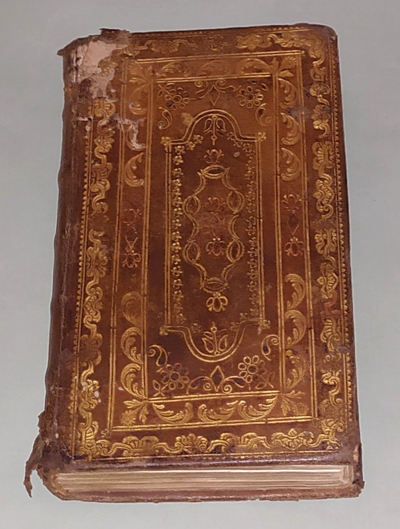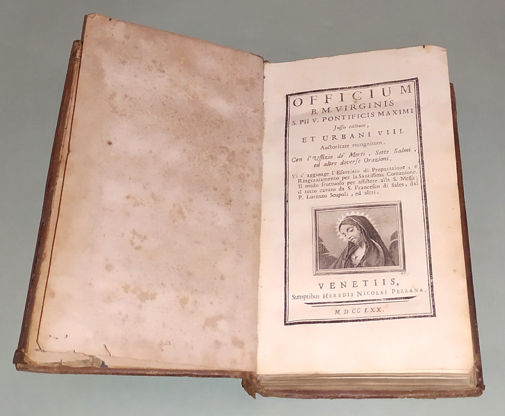Officium B.M.Verginis S.Pii Pontificis Maximi Jussu editum, et Urbani VIII. Auctoritate recognitum. Venetiis, Pezzana, 1770. In 8vo (cm.20x12); pp.24n.nn., 384. Vignetta al frontespizio e sette tavole fuori testo. Legatura in cuoio avana del secolo XVIII. Doppia cornice di motivi dorati inquadrano fregio a losanga in oro. Dorso a cordoni. Fori da tarlo e mancanza al piatto anteriore. Tagli dorati.