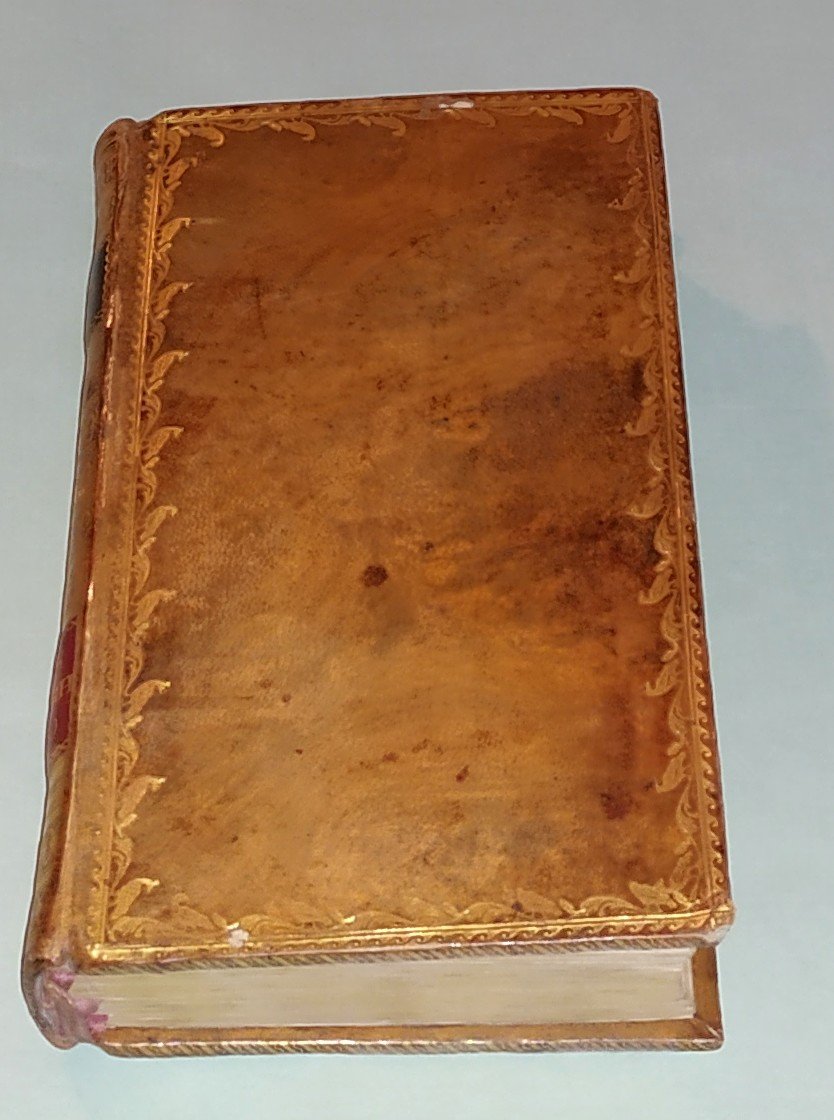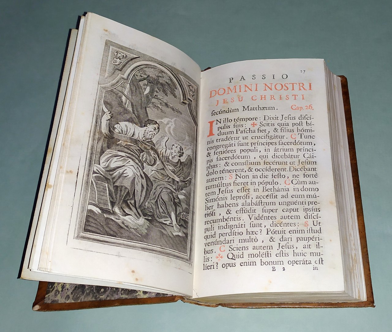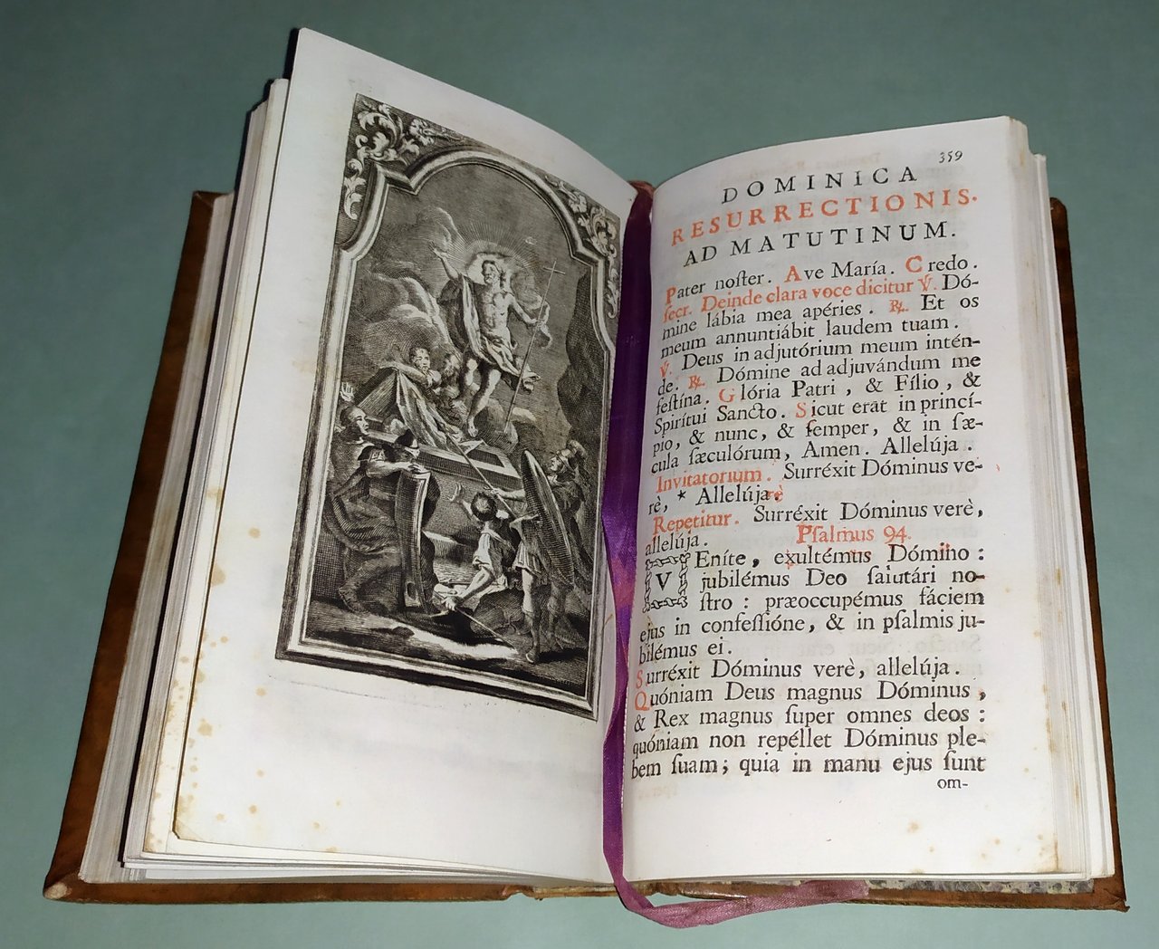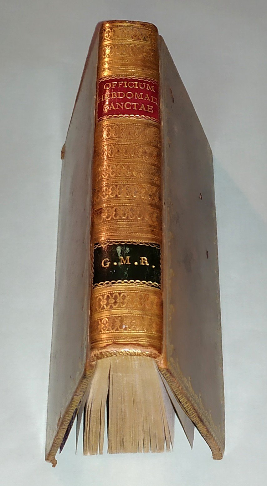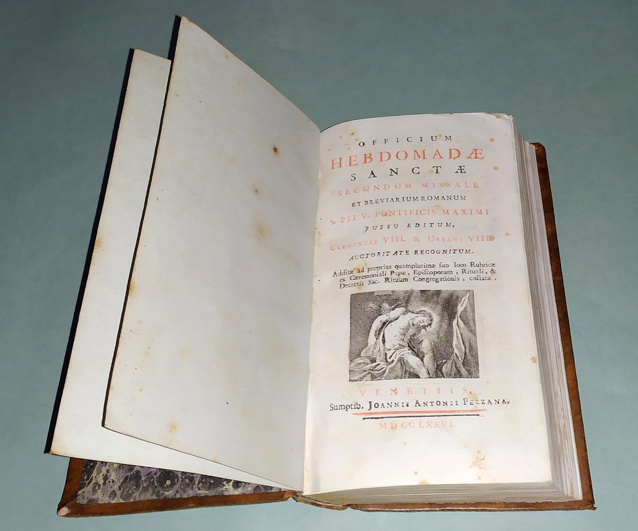 Officium Hebdomadae Sanctae Secundum Missale et Breviarium Romanum S. Pii V Pontificis Maximi jussu editum, Clementis VIII & Urbani VIII auctoritate recognitum. Venetiis, Pezzana, 1776. In 8vo (cm.19x11); pp.492. Titolo e testo con caratteri neri e rossi. Vignetta al frontespizio e 5 tavole a piena pagina fuori testo. Legatura in cuoio marrone del secolo XVIII. Elegante fregio dorato inquadra i piatti, dorso con doppio tassello e doviziosi fregi in oro. Profili dorati.