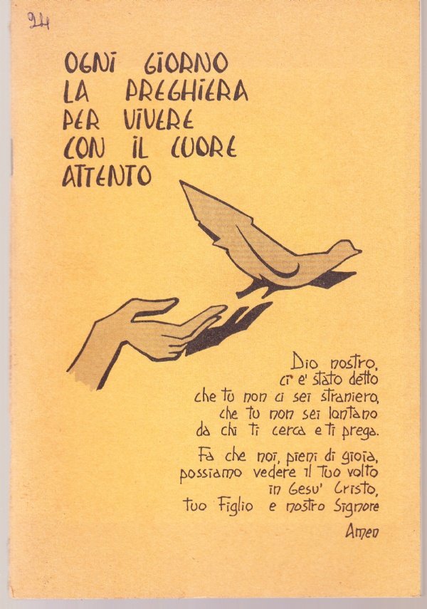 69 pagine, spillato, testo dattilografato. VOLUME IN BUONE CONDIZIONI, MACCHIE E INGIALLIMENTI, TIMBRO IN PRIMA PAGINA. 2 settimane di preghiere composte da: Salmo - Lettura biblica - Intercessione - Orazione libera - Orazione del Signore - Cantico - Orazione finale - Benedizione