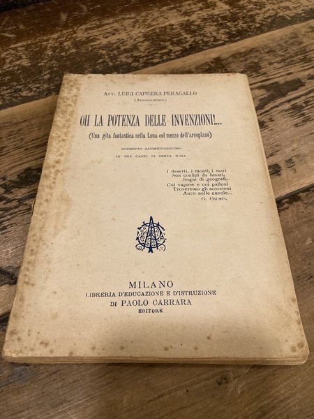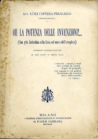 Oh la potenza delle invenzioni !. (Una gita fantastica nella Luna col mezzo dell'aeroplano). Poemetto satirico - giocoso in tre canti di terza rima