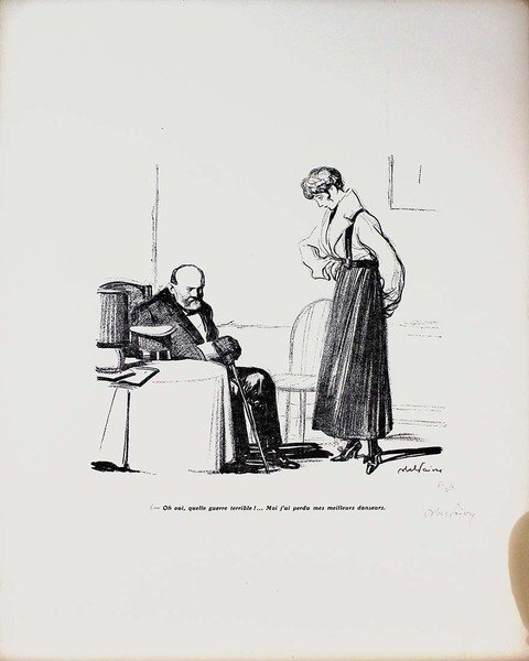 Abel Jules Faivre (Lione 1867 - Nizza 1945) Litografia originale firmata a mano dall'artista.Dimensioni: 56 x 38,5 cmCon certificato di autenticità C.O.A.Ingiallimento laterale come da foto.Esemplare numero 62/250 La raccolta di litografie umoristiche del caricaturista francese Abel Faivre (Lione 1867-Nizza 1945), andata a confluire nel volume Jours de guerre,fu pubblicata in due tomi tra il 1915 e il 1919. Con il procedere del conflitto, l'opinione pubblica di tutti i paesi coinvolti,che aveva dapprima affrontato tale evento con ottimismo, mutò rapidamente opinione sino a considerare la guerra, senza mezzi termini,come un avvenimento rovinoso. In tale contesto, le vignette satiriche di guerra possedevano un potente effetto catartico,adempivano un ruolo sociale irrinunciabile, fornendo una valvola di sfogo all’incombere dal più cupo pessimismo. Abel Jules Faivre (Lyon 1867 - Nizza 1945) Originale Lithographie vom Künstler von Hand signiert.Abmessungen: 56 x 38,5 cmMit Echtheitszertifikat C.O.A.Seitliche Vergilbung wie auf dem Foto.Kopieren Sie die Nummer 62/250 Die Sammlung humorvoller Lithographien des französischen Karikaturisten Abel Faivre (Lyon 1867-Nizza 1945), die in den Band Jours de guerre floss,es wurde zwischen 1915 und 1919 in zwei Bänden veröffentlicht. Im Verlauf des Konflikts wurde die öffentliche Meinung in allen beteiligten LändernWer dieses Ereignis anfangs mit Optimismus konfrontiert hatte, änderte schnell seine Meinung, um den Krieg ohne Zweifel zu betrachten.wie ein ruinöses Ereignis. In diesem Zusammenhang hatten die satirischen Kriegskarikaturen eine starke kathartische Wirkung.Sie erfüllten eine unverzichtbare soziale Rolle und bildeten ein Entlastungsventil gegen den dunkelsten Pessimismus. Abel Jules Faivre (Lyon 1867 - Nice 1945) Lithographie originale signée à la main par l'artiste.Dimensions: 56 x 38,5 cmAvec certificat d'authenticité C.O.A.Jaunissement latéral comme sur la photo.Copie numéro 62/250 La collection de lithographies humoristiques du caricaturiste français Abel Faivre (Lyon 1867-Nice 1945), qui allait se fondre dans le volume Jours de guerre,il a été publié en deux volumes entre 1915 et 1919. À mesure que le conflit progressait, l'opinion publique de tous les pays impliqués,qui avait d'abord fait face à cet événement avec optimisme, a rapidement changé d'avis pour envisager la guerre, en termes non équivoques,comme un événement ruineux. Dans ce contexte, les caricatures de guerre satiriques ont eu un puissant effet cathartique,ils remplissaient un rôle social indispensable, fournissant une soupape de décharge du pessimisme le plus sombre. Abel Jules Faivre (Lyon 1867 - Nice 1945) Original lithograph signed by hand by the artist.Dimensions: 56 x 38.5 cmWith certificate of authenticity C.O.A.Lateral yellowing as in the photo.Copy number 62/250 The collection of humorous lithographs by the French caricaturist Abel Faivre (Lyon 1867-Nice 1945), which went to flow into the volume Jours de guerre,it was published in two volumes between 1915 and 1919. As the conflict progressed, public opinion in all the countries involved,who had initially faced this event with optimism, quickly changed his opinion to consider the war, in no uncertain terms,like a ruinous event. In this context, the satirical war cartoons had a powerful cathartic effect,they fulfilled an indispensable social role, providing a relief valve from the darkest pessimism.
