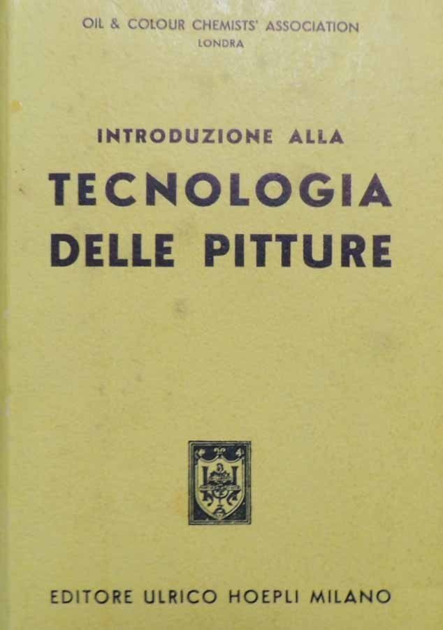 Oil and Colour Chemists’ Association – Londra, Introduzione alla tecnologia delle pitture, rassegna compilata dai soci N. A. Bennet et al., tradotta e annotata dal socio G. Balbi, Editore Ulrico Hoepli, Milano 1957, pp. XI, 232, ill. b.n., 5 c. di tavv. f.t. ill. b.n., cm 15, br. ed. Collana Manuali Hoepli. Fioriture, qualche sporadica sottolineatura a pastello, minima brunitura della carta, ma nel complesso copia ben conservata.