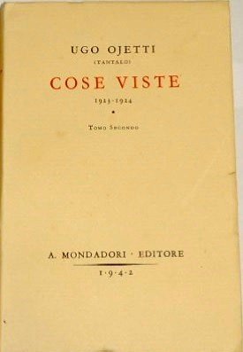Ugo Ojetti (Tantalo), Cose viste 1923-1924, tomo secondo, A. Mondadori Editore, s.l. (ma stampato a Verona, presso le Officine Grafiche A. Mondadori) 1942, pp. 317, cm 20, br. ed. con sovr. e velina. Minime fioriture alla sovraccoperta e a prime e ultime pagine, per il resto esemplare davvero ben conservato.