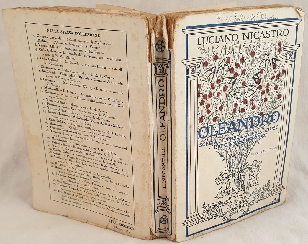 Edizione del 1930 di questa opera raccolta di prose e poesie ad uso del ginansio a cura di Luciano Nicastro. All'interno brani di Grimm, Perrault, Andersen, Papini, Croce, Nievo, Soffici, Grossi, Verga, Chairini, Dandolo, Ferraro, Panzini, Leopardi,Della Casa, De Amicis, Carducci, Fogazzaro ecc. Copertina di Cisari. Alcune sottolineature e note manoscritte. In buone condizioni. Copertina editoriale in buone condizioni generali con lievi usure ai margini e dorso. Legatura in buone condizioni ma qualche pagina staccata. All'interno le pagine si presentano in buone condizioni con rare fioriture. Ultima pagina con parti mancanti. In 8. Dim. 20,5x14,5 cm. Pp. 487. Edition of 1930 of this collection of proses and poems by Luciano Nicastro. Inside Grimm, Perrault, Andersen, Papini, Croce, Nievo, Soffici, Grossi, Verga, Chairini, Dandolo, Ferraro, Panzini, Leopardi,Della Casa, De Amicis, Carducci, Fogazzaro ecc. Cover by Cisari. Some underlinings and handwritten notes. In good conditions. Editorial cover in good general conditions slightly worn in the edges and spine. Binding in poor conditions but some page detached. Pages in good conditions with occasional foxings. Last page with missing parts. In 8. Dim. 20,5x14,5 cm. Pp. 487.