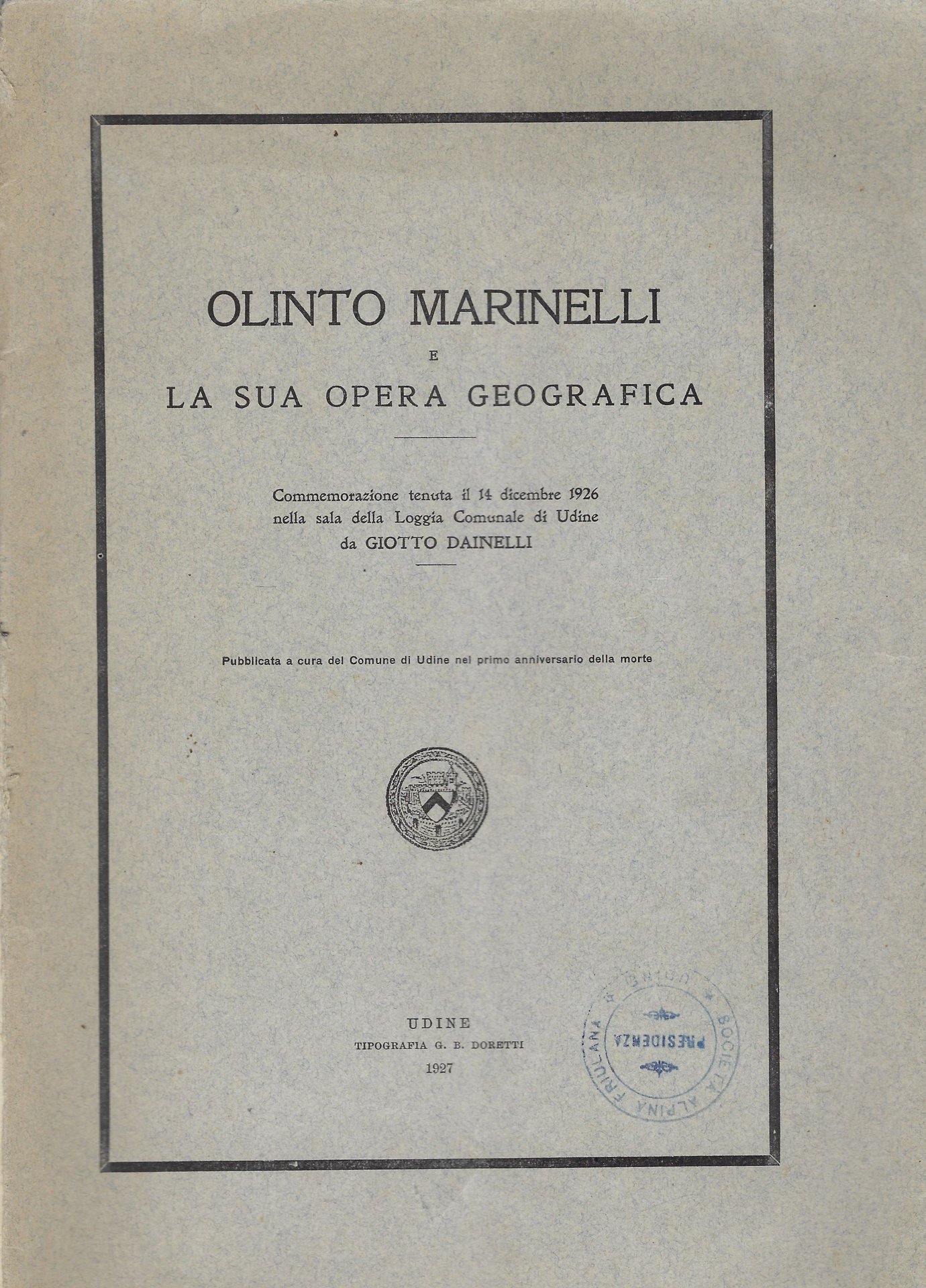 Commemorazione tenuta il 14 dicembre 1926 nella sala della Loggia Comunale di Udine dal prof. Giotto Dainelli, pubblicata a cura del Comune di Udine nel primo anniversario della morte.