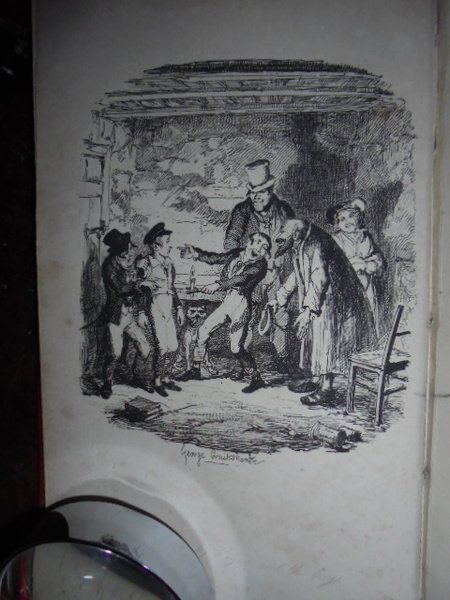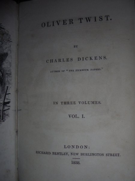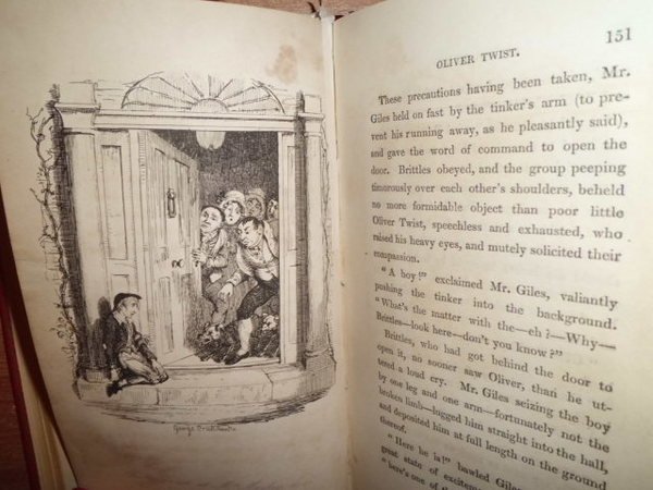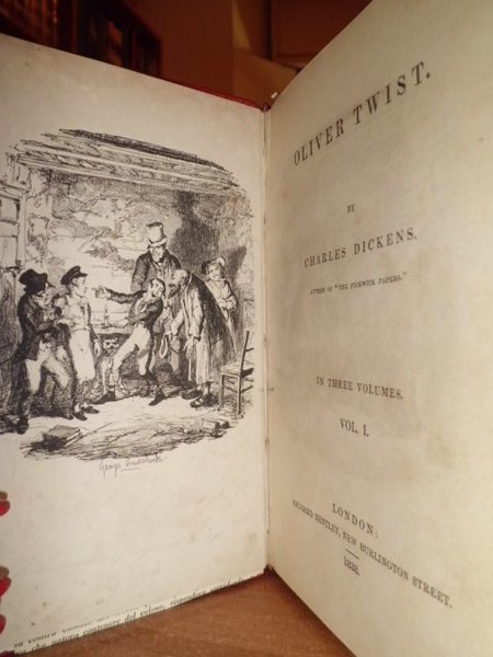 Dickens, Charles. Oliver Twist. London, Richard Bentley, 1838. 3 volumi in - 8°, legati in piena pelle rossa, dorsi a nervi con tassello e fregi in oro, piani con riquadro e una grande bordura aurea. Vol. I: (4), 331, (5) pp. e 9 tavole f.t. Vol. II: (4), 307, (1) pp. e 7 tavole f.t. Vol. III: (2), 313, (1) pp. e 8 tavole f.t. Tutte le tavole sono incise in litografia da George Cruikshank (1792 - 1878), famoso artista inglese. Bellissimo esemplare della rara edizione originale. Houfe, Diction. of British book illustrators, p. 273. Manca al Lowndes.