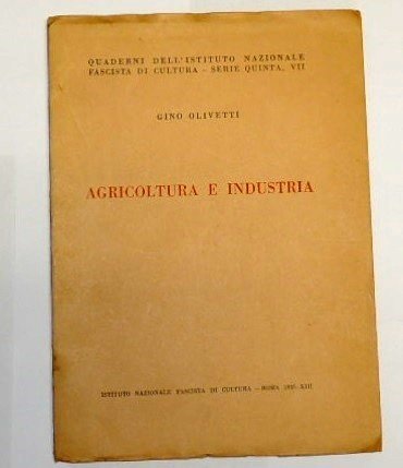 Gino Olivetti, Agricoltura e industria, Istituto Nazionale Fascista di Cultura, Roma 1935, pp. 42, cm 23, br. ed. collana Quaderni dell'Istituto Nazionale Fascista di Cultura, serie quinta, n. 7. Intonso.
