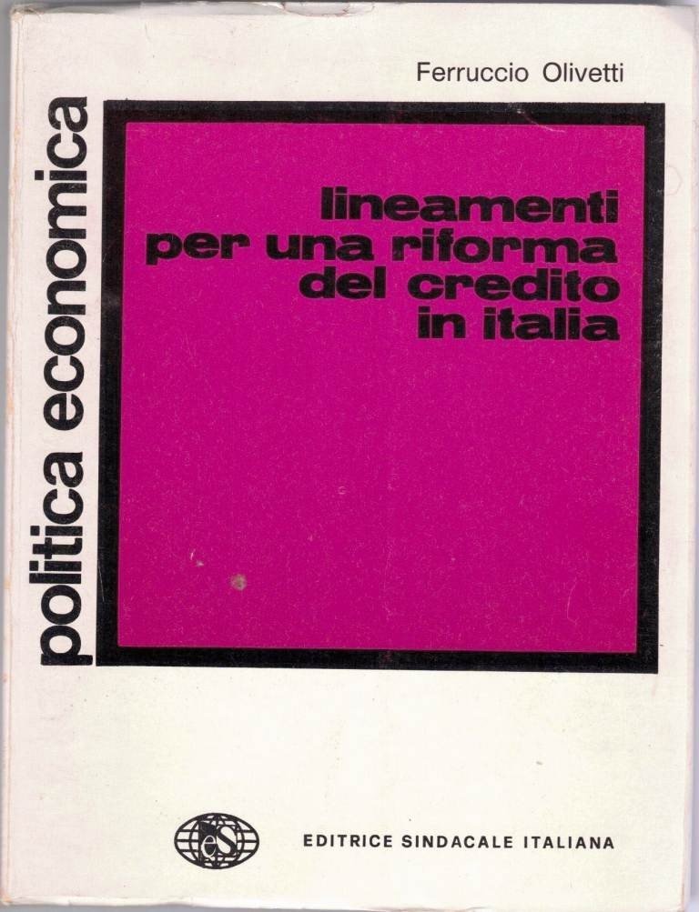 Ferruccio Olivetti, Lineamenti per una riforma del credito in Italia, Editrice Sindacale Italiana, s.l. (ma stampato a Roma, presso la Tipolitografia Salemi) 1974, rist., pp. 460, cm 21, br. ed. con alette. Collana Politica economica. Minime tracce d’uso alla brossura, lieve brunitura della carta, per il resto ben conservato.