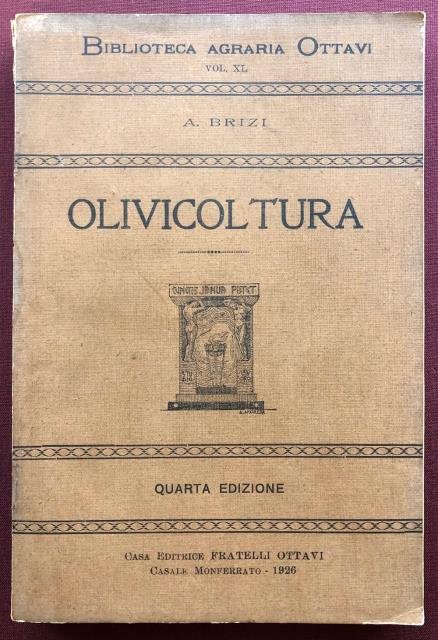 Biblioteca Agraria Ottavi. Volume XL. Quarta Edizione. Casa Editrice Fratelli Ottavi, Casale Monferrato, 1926. In 8vo, pp. 275 + 23 pp. non num. di cui alcune ancora con tabelle sulla varietà delle olive, altre editoriali e alcune infine con pubblicità aziendali, tutto in materia agraria, molte ill. fot. o dis. in b/n n. t. Una macchia di umido ha scolorito una minima parte della brossura posteriore, volume in buono stato di conservazione.