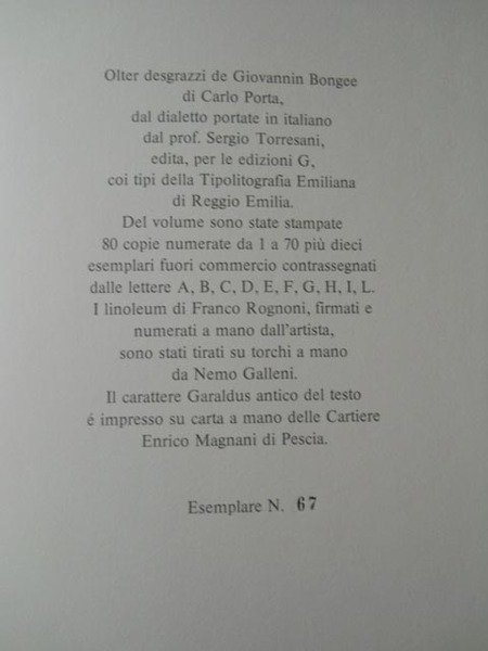 Edizione: tiratura di 80 copie numerate da 1 a 70 + 10 es. fuori commercio siglati con lettere dalla a alla l. il nostro è l'es. n. 67.