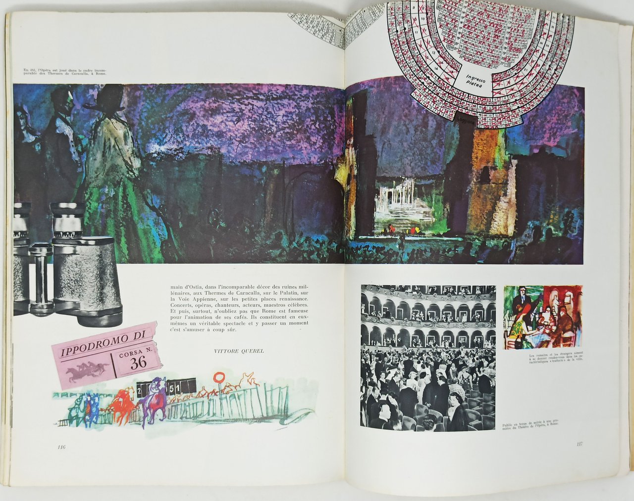 XVIIeme edition des jeux olympiques Rome, MCMLX. Edite par l'Office National Italien de Tourisme, Rome. ENIT. Reproductions, impression et reliure Amilcare Pizzi, Milano. Traduit de l'Italien par M.lle Yolande Ponsi avec la collaboration de MM. Nicolas Moroso et Pierre Musa. Premiere edition. Anno di stampa: 1958 (decembre). Lingua del testo: Francese. Dimensioni: 24,5 x 34 cm circa. Numerose illustrazioni a colori e in nero. Stato di conservazione: Segni del tempo e dell'uso, particolarmente evidenti sulla copertina che, come si può notare dalle stesse fotografie, presenta delle macchie sul piatto posteriore oltrechè pieghette e leggere strpopicciature; qualche piccola orecchietta interna, una macchia (presumibilmente di inchiostro) che copre in parte tre parole su pagina 112 (il testo è comunque leggibile e comprensibile) ma, nel complesso, un esemplare più che discretamente conservato. Al fondo del volume sono presenti pagine pubblicitarie non numerate. Una delle ultime sezion è dedicata a 5 competizioni antiche incorporate nella manifestazione olimpionica: il 'Palio dei Balestrieri' di Gubbio, la 'Partita a scacchi viventi' di Marostica, la 'Giostra della Quintana' di Foligno, il 'Gioco del Calcio' fiorentino e il 'Gioco del Ponte' di Pisa.