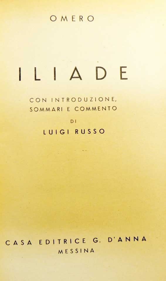 Omero, Iliade, con introduzione, sommario e commento di Luigi Russo, Casa Editrice G. D’Anna, Messina 1940, pp. 392, cm 20, legatura in mezza tela con titoli in oro al dorso. Etichetta con segnatura di collocazione al dorso, lievissime tracce d’uso alla legatura, cerniera del piatto anteriore leggermente fessurata, per il resto esemplare ben conservato e con legatura ancora solida.
