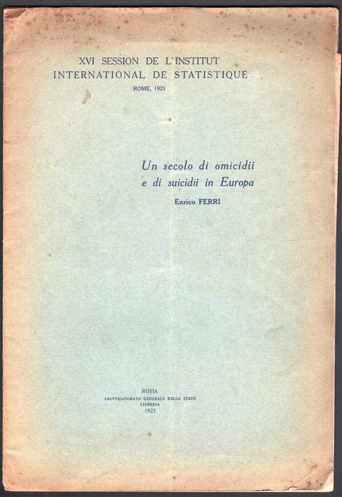 UN SECOLO DI OMICIDII E DI SUICIDII IN EUROPA ENRICO FERRI PROVVEDITORATO GENERALE DELLO STATO LIBRERIA 1925. PP. 19 CM. 26 X 18 L 5612 ALL'INTERNO TRE FOGLI SU CARTA PESANTE CON ANNOTAZIONI MANOSCRITTE DI STATISTICHE SUGLI OMICIDI VOLONTARI NELLE REGIONI ITALIANE TRA IL 1907 E IL 1914 LEGATURA EDITORIALE MORBIDA CON FIORITURE AI MARGINI DEI PIATTI E LEGGERA OSSIDAZIONE SEMPRE AI MARGINI, LEGGERA ARRICCIATURA DEGLI ANGOLI DI TUTTO IL VOLUME, PIEGA CENTRALE SU TUTTO IL VOLUME, SEGNI A MATITA BLU ALLE PAG. 3-4-5-6-11-12-14-1516-17. UNITO TRE FOGLI IN CARTA PESANTE CON STATISTICHE MANOSCRITTE SUGLI OMICIDI E SUICIDI NELLE VARIE CITTA' ITALIANE.