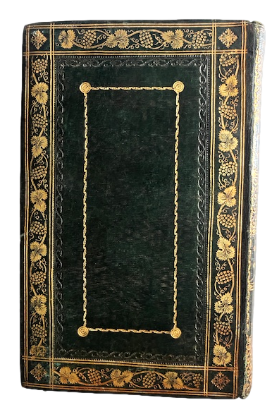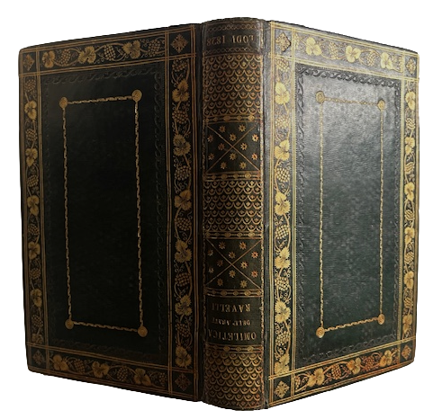 In 4°; XV, [1], 253, [5] pp. Bellissima legatura artigianale coeva in pieno marocchino verde con titolo e ricchissimi fregi in oro al dorso. Ai piatti magnifiche cornici in oro e a secco con grappoli d'uva e foglie di vite. Eleganti cornici in oro ai contro piatti. Filetti con foglie ai tagli dei piatti. Legatura in ottime condizioni di conservazione come anche l'opera al suo interno se non per una censura che ha fatto togliere le pagine d'introduzione poste dopo il frontespizio, da II a XV e delle pagine da 1 a 4 con la dedicatoria con la presenza, nel margine interno, di rimanenza dei fogli. Forse L'opera, quindi, dopo il frontespizio, presenta il capitolo primo. Forse questa era una copia di presentazione sulla quale è intervenuto l'autore o l'editore per alcuni cambiamenti o ripensamenti. Rarissima edizione di quest'opera di omiletica e cioè di quel ramo degli studi teologici cristiani che si occupa dell'arte e degli studi della predicazione. Opera stampata su carta di ottima qualità. Prima ed unica edizione, in bellissima legatura artigianale coeva. Rif. Bibl.: IT\ICCU\MILE\052790.