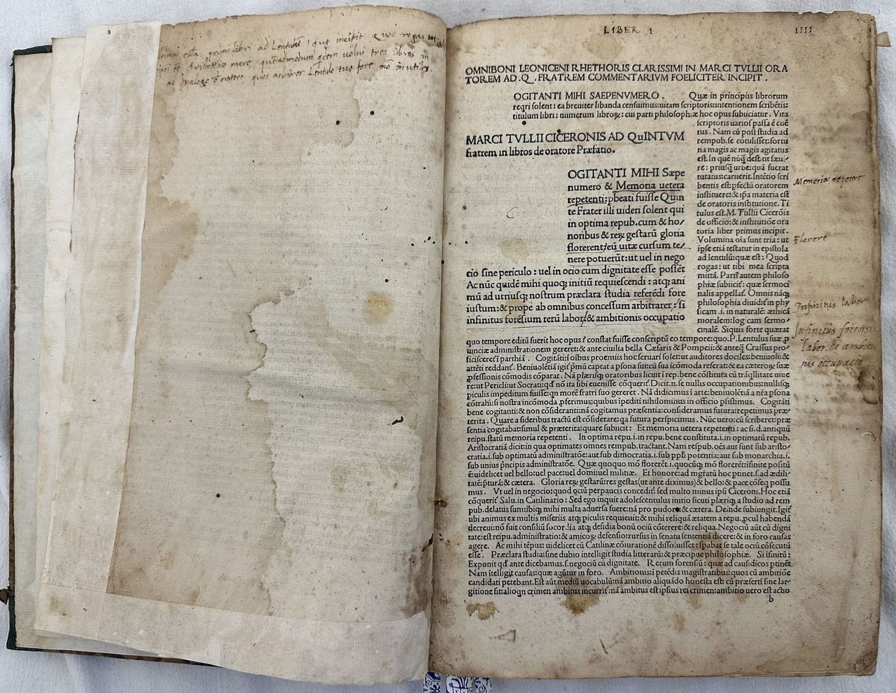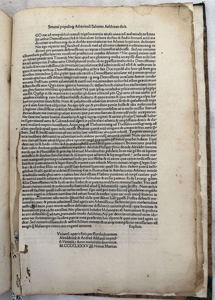 OMNIBONI LEONICENI RHETORIS CLARISSIMI IN MARCI TULLII ORATOREM AD Q. FRATREM COMMENTARIUM FOELICITER INCIPIT DEMOSTHENIS ORATIO IN AESCHINEM SOELICITER EXPLICIT PER LEONARDUM ARETINUM IN LATINUM CONVERSA