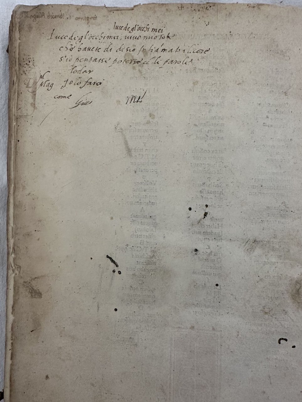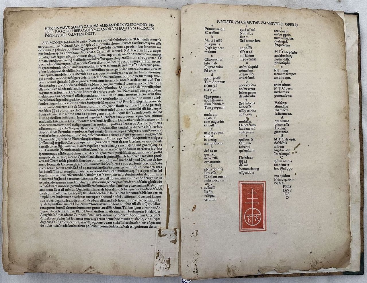 Raro incunabolo del 1485, il De Oratore di Marco Tutllio Cicerone commentato da Ognibene Bonisoli (1412-1474). Risultano mancanti le carte a1, a2, a3. Il titolo all'incipit della carta b1r, i dati di stampa alla carta D5. Registro in rosso e nero. Testo latino e commento incorniciato. All'interno: Topica di Cicerone, Partitiones oratoriae, Brutus, De optimo genere oratorum, Oratio de laudibus eloquentiae di Ognibene Bonisoli, Commentariorum petitionis di Cicerone, le opere In Ctesiphontes ed epistola XII tradotte dal latino da Leonardo Bruni detto Leonardo Aretino (Arezzo 1370-Firenze 1444). Numerose antiche note manoscritte e tre finissimi disegni tra i quali un trovatore in un bosco che suona una cornamusa. Una borraccia e un bagaglio appeso a un albero. In buone condizioni. Copertina in mezza pelle ottocentesca con titolo e decorazioni in oro al dorso in buone condizioni con lievi usure ai margini e dorso. Legatura in buone condizioni. Pagine in buone condizioni con fioriture. Angolo superiore destro mancante alla carta m5 con leggera perdita di testo. Risultano mancanti el carte a1, a2, a3. Alcuni segni di tarlo marginali. Rinforzo marginale alla carta a4. Alcune fioriture, macchie e mende. Strappo marginale alla carta D5 che lede in parte il testo. In folio. 31x22 cm. Pp. (208). Peso Kg. 1,360.Scarce incunbable of 1485, De Oratore by Marco Tutllio Cicerone commented by Ognibene Bonisoli (1412-1474). Pages a1, a2, a3 lack. The title in the 'incipit of page b1r, publishing data in page D5. Register in red and black. Latin text and framed comment. Inside: Topica di Cicerone, Partitiones oratoriae, Brutus, De optimo genere oratorum, Oratio de laudibus eloquentiae di Ognibene Bonisoli, Commentariorum petitionis di Cicerone, le opere In Ctesiphontes ed epistola XII translated into latin by Leonardo Bruni known as Leonardo Aretino (Arezzo 1370-Firenze 1444). Different handwritten notes and three very fine drawings between them a trobadour in a wood singing a bagpipes. His baggage hanged in the tree. In good conditions. Half leather cover of 19th century with gilted title in the spine in good conditions lightly worn in the extremities. Binding in good conditions. Inside pages are in good conditions with foxing. Upper right corner missing in page m5 with light loss of text. Pages a1, a2, a3 lack. Some wormings in the corners. Reinforcement in the edges of page a4. Some foxing, stains and usage signs. Tear in the edges of pages D5 partially ruining the text. In folio. 31x22 cm. Pp. (208). Weight Kg. 1,360.