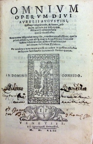 In-16 p. (mm. 156x100), p. pergamena coeva, tit. ms. al dorso, 24 cc.nn., 451 cc.num., 1 c.nn. (di colophon che riporta: Venetiis, apud Cominum de Tridino Montisferrati, Anno Domini MDXLI); marca editoriale xilografata al frontespizio (S. Bernardino da Siena con disco radiante con monogramma di Cristo IHS e mitra in basso, entro cornice decorata; sotto, un globo con le iniziali I.P.S. tra due putti alati). Segue "Divi Aurelii Augustini Hipponensis Episcopi Retractationum Libri II". stesso editore e data (1541) e stessa marca, cc.num. 36 (con colophon al recto dell'ultima); ornati da grandi capilettera figurati a vignetta, inc. su legno.Come precisato da ICCU, l'Indice indica tre tomi, ma al secondo Varia miscelanea de haeresibus et haereticis, segue il quarto indicato sul frontespizio De septem ecclesiae sacrosanctis Sacramentis, ex divo Aurelio Augustino et Iohannem Pesselium Tylanum.S. Agostino, vescovo di Ippona, uno dei quattro grandi Dottori della Chiesa occidentale, detto il Dottore della Grazia' (Tagaste in Numidia 354 - Ippona 430). Nei 34 anni di episcopato lo tennero occupato, oltre le cure costanti dedicate alla sua chiesa, la copiosa corrispondenza, la predicazione (i sermoni conservati e noti finora sono più di 500), i concilii e le eresie e scismi, la lotta contro i quali assorbì grandissima parte dell'attività letteraria, che ha reso Agostino proverbiale come uno non solo dei più dotti e profondi, ma dei più fecondi scrittori mai esistiti. Così Diz. Treccani,I, p. 179.Antiche firme di apparten. mss. al frontesp.; leggerm. corto del marg. super.; alone lieve e solo margin. interc. nel testo; a parte questi difetti è certamente un buon esemplare.