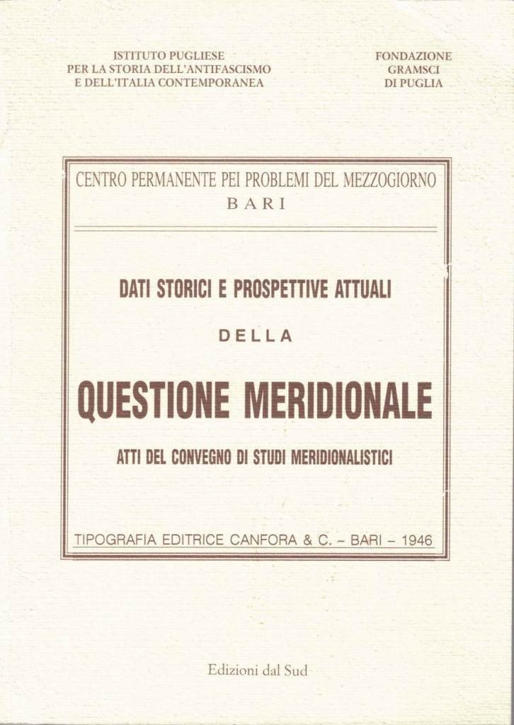 Atti del Convegno di Studi sui problemi del Mezzogiorno. Bari, 3-4-5 dicembre 1944, editi a cura del Centro permanente pei problemi del Mezzogiorno, Edizioni dal Sud, Modugno 1995, pp. 274, cm 21, br. ed. In testa al frontespizio: Istituto pugliese per la storia dell’antifascismo e dell’Italia contemporanea – Fondazione Gramsci Puglia. Ripubblicazione degli Atti del Convegno di Studi sui problemi del Mezzogiorno (Bari, 3-4-5 dicembre 1944, ed. originale Tipografia Editrice Canfora e C., Bari 1946), realizzata nell’ambito delle iniziative per celebrare il Cinquantennale della Resistenza e della Liberazione. Indice: A chi legge – Il saluto agli intervenuti – Il discorso inaugurale di Omodeo – La relazione Dorso: La classe dirigente meridionale – La relazione Rossi-Doria: La terra: il latifondo e il frazionamento – La discussione – La replica di Dorso – La relazione Liuni: problemi di politica agraria immediata – La relazione Di Zonno – La discussione – La replica di Liuni – La replica di Di Zonno: problemi di politica agraria immediata – La relazione Generali: L’industrializzazione del Mezzogiorno – La discussione – La replica di Generali – Il saluto del sindaco di Bari – La relazione Cifarelli: Le autonomie politiche – Gli ordini del giorno – Appendice. La relazione Ciasca: La bonifica agraria del Mezzogiorno – Nota storica, di V. A. Leuzzi – Appendice documentaria – Schede biografiche. Piccola firma d’appartenenza al frontespizio. Minime tracce d’uso e alcune piccolissime abrasioni alla brossura, lieve ingiallitura della carta, per il resto ben conservato.