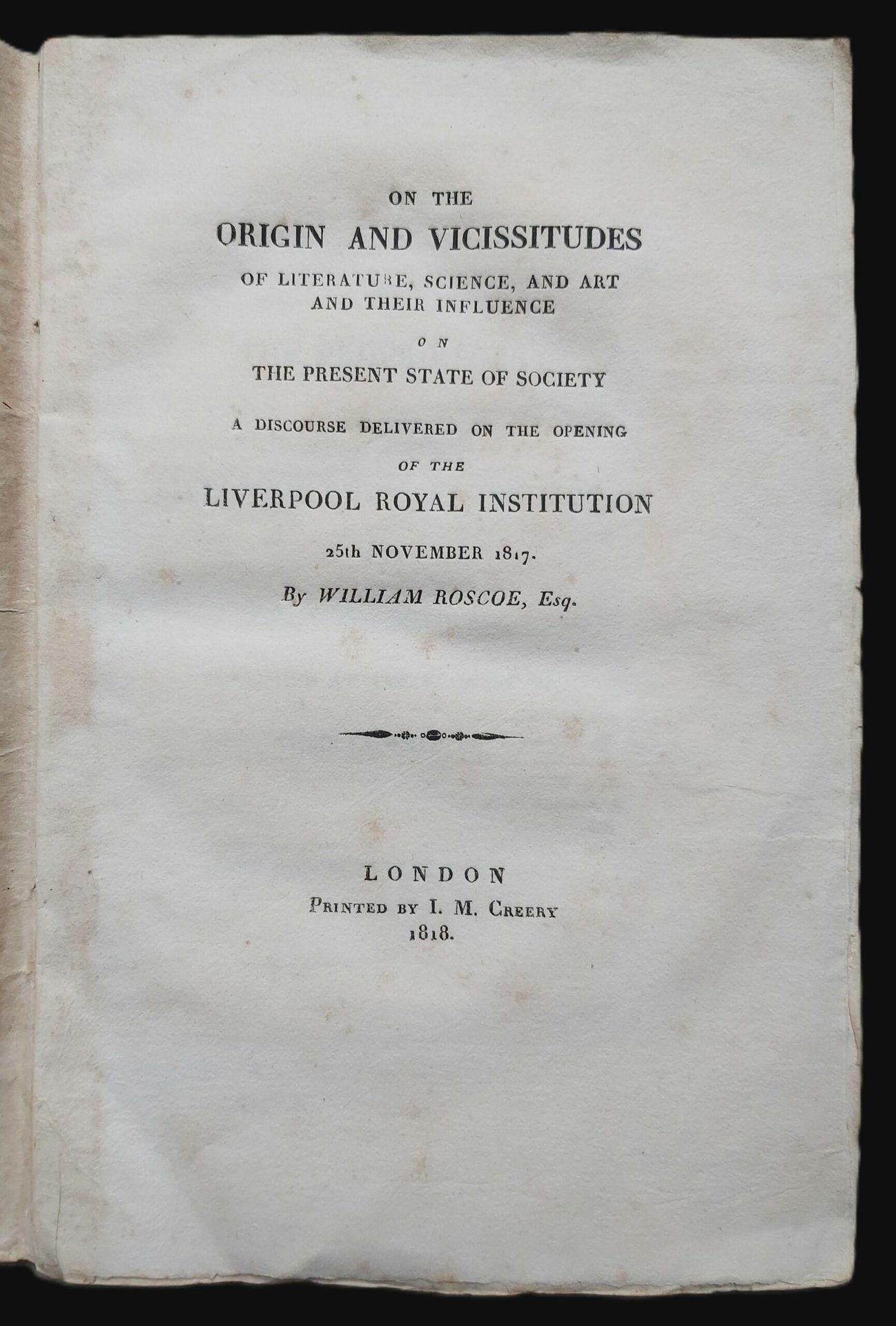 ON THE ORIGIN AND VICISSITUDES of literature, science and art and their influence on the present state of society. A discours delivered on the opening of the Liverpool Royal Institution 25th November 1817.