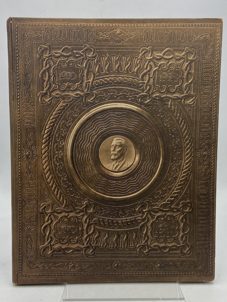 Cartonato editoriale illustrato a riproduzione di legatura commemorativa, cm 33x25, pp 62 (2), alcune illustrazioni in nero e tabelle ripiegate. Volume celebrativo dei 25 anni di direzione di Natale Cesaris delle assicurazioni Italiana Incendio, Italiana Infortuni, Sindacato Lombardo Infortuni; il volume riproduce la legatura dell’album ricordo con le firme dei collaboratori, la legatura in oggetto, le pagine in pergamena e altri ricordi offerti all’ingegnere sono riprodotti all’interno; alcuni testi celebrativi e notizie sulla storia e lo sviluppo dell’azienda, con fregi di E. Calori.
