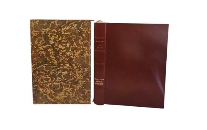 Rilegato in tutta pelle rossa con titolo in oro al dorso entro cofanetto in carta marmorizzata