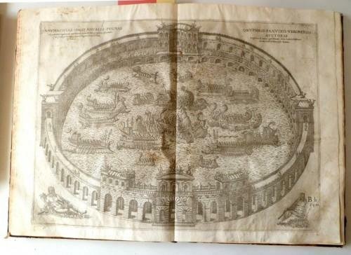 in folio (cm 36,7x26), pp. 2 b., 18 nn., 148, 17 nn., 1 b., 124, 2 b.; leg. coeva m/pelle con angoli, ds. a nervi, piatti marmor., tagli pennellati, grande frontespizio architettonico con 8 riquadri, testatine e capilettera. Con 33 tavv. di cui 24 a doppia pag., 2 ripiegate, 5 a piena pag. (compreso front.) e 2 ritratti di Panvinio e di Argolo, che illustrano giochi, trionfi e circhi a Roma, Pompei e Costantinopoli; alcune tavole sono datate 1580. L'A. frequentò la Scuola degli accoliti della cattedrale di Verona che, all'epoca del vescovo riformatore Gian Matteo Giberti, si distingueva per la disciplina e per l'ampiezza del suo programma educativo sia nelle lettere greche e latine sia nella musica. Nel 1546, a Napoli, proseguì la sua formazione presso lo Studio Generale dell'Ordine agostiniano; nel 1554 ottenne il permesso straordinario di vivere fuori dal convento e di dedicarsi in proprio agli studi storici sulle antichità romane e sulla storia ecclesiastica. Mancano le tavv.: D, una delle 2 tavv. nominate G, la N, una delle due tavv. nominate Pompae circensis, le ultime 5 pp. di Additamento e il capitello sup.; in compenso c'è una tav. a pag. 63 non nominata nell'indice e intitolata: Circi et ludicri circensis antiquom marmoreum frustum.; lievi sbucc. alla leg. e lievi tracce d'uso, ma opera ben conservata. 430/30