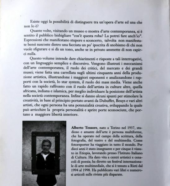Esiste oggi la possibilità di distinguere tra un'opera d'arte ed una che non lo è? Quante volte, visitando un museo o mostra d'arte contemporanea, si e sentito il pubblico bisbigliare "cos'è questa roba? La potrei fare anch'io". Espressioni che manifestano stupore e sconcerto, talvolta non manifesta- te bensì nascoste dietro una facciata un po' ipocrita di snobismo di chi non vuole sfigurare e si dà un tono, anche se in privato ammette di non capirci nulla. Questo volume intende dare chiarimenti e risposte a tali interrogativi, con un linguaggio semplice e discorsivo. Vengono illustrati i meccanismi dell'arte contemporanea, il ruolo dei critici, del mercato e dei grandi musei; viene fatta una carrellata sugli ultimi cinquanta anni della produzione artistica, illustrandone i maggiori esponenti e analizzandone i rapporti con la società, lo star system, il ruolo dei mass media. Viene anche fatto un rapido raffronto con il ruolo dell'artista in culture altre, quella africana, indiana e islamica, per meglio individuare la posizione dell'artista nella società contemporanea. Infine si danno alcuni spunti per stimolare la creatività, in base al principio portato avanti da Dubuffet, Beuys e vari altri artisti, che ogni persona ha una potenzialità creativa, sviluppando la quale può arricchire la propria personalità e aprire porte sconosciute, che portano a maggiore libertà interiore.