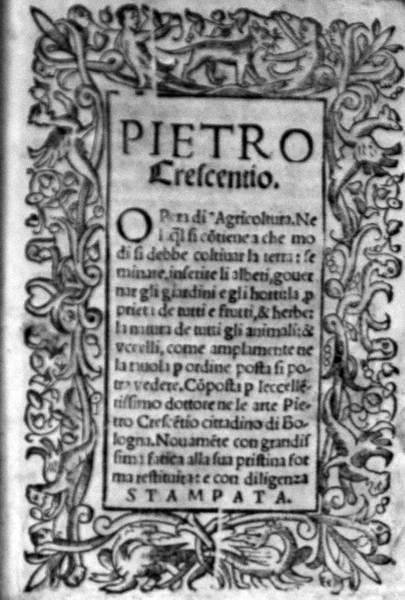 In-16 p. (mm. 152 x 98), p. pergam. coeva (risg. rifatti), titolo ms. al dorso, cc.nn. 392, cornice figurata al frontesp., con bella xilografia a p. pag. al verso della terza carta; ornato da grandi iniz. figur. a vignetta inc. su legno.<br>Di questo celebre trattato, che ebbe numerosiss. edizioni a partire dal XV secolo, cosi' precisa Gamba,374: "Il Crescenzio scrisse quest'opera in latino tra il 1307 e il 1311, ed è stata opinione di Leonardo Salviati, che'l volgarizzamento siasi fatto verso il 1350. Egli notò che dee riguardarsi come una delle principali scritture del volgar nostro, si' per li nomi specialissimi degli affari della villa, e talora anche di astrologia e di medicina e di altre arti, e si' perchè in genere di buone voci e di pura lingua è ripiena..".<br>Cfr. anche Sander,I,2240: Page du titre, encadrement orné à la grotesque; dans le haut, le chat des Sessa. Bois de page, portrait de l'auteur assis in cathedra - Ceresoli, p. 184.<br>Esemplare corto del margine sup., peraltro ben conservato.
