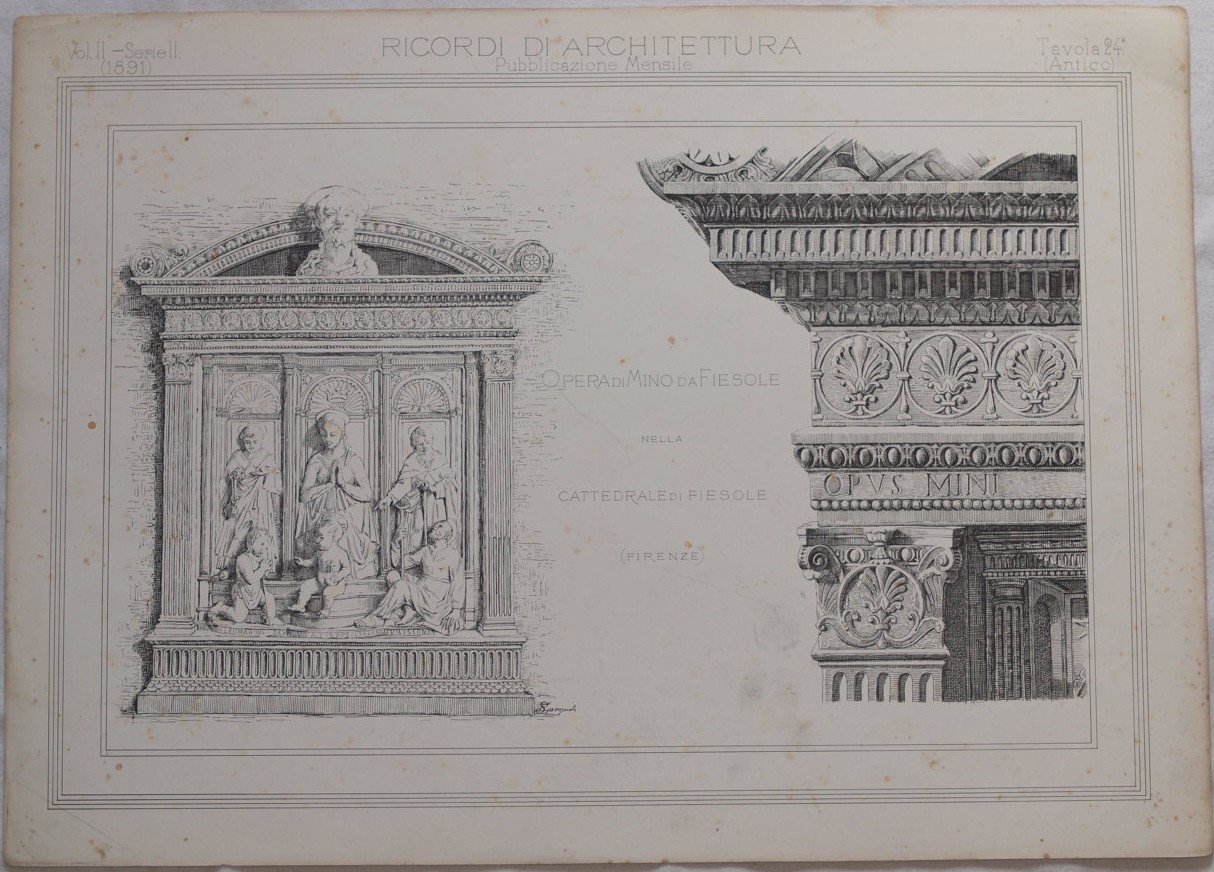 Bella litografia di architettura del 1891 tratta dal periodico mensile "Ricordi di architettura" pubblicato tra il 1878 e il 1900 diretto da Giacomo Roster, C. Corinti e E. Bartoli. La rivista documentava le numerose progettazioni, talvolta anche di riduzione e di ampliamento che fecero molti architetti dell'epoca. Di grandi dimensioni. TECNICA: Litografia DIMENSIONI FOGLIO: cm 53,5x38,5 DIMENSIONI INCISIONE: cm 48,5x33 EPOCA: 1891 CONDIZIONI: Buone condizioni, qualche fioritura. Beautiful lythography of architecture of 1891 taken from the monthly magazine "Ricordi di architettura" published between 1878 and 1900 directed by Giacomo Roster, C. Corinti and E. Bartoli. The magazine documented different projects, sometimes alos of reductioning and expansion done by many architects of that time. Of big size. TECHNIQUE: Lytography PAGE SIZE: cm 53,5x38,5 PRINT'S SIZE: cm 48,5x33 PERIOD: 1891 CONDITION: good conditions. Some yellowings