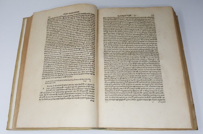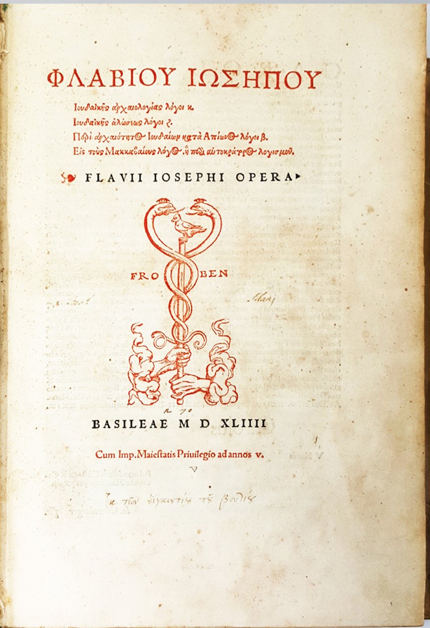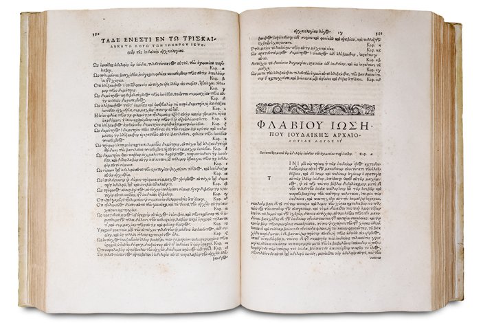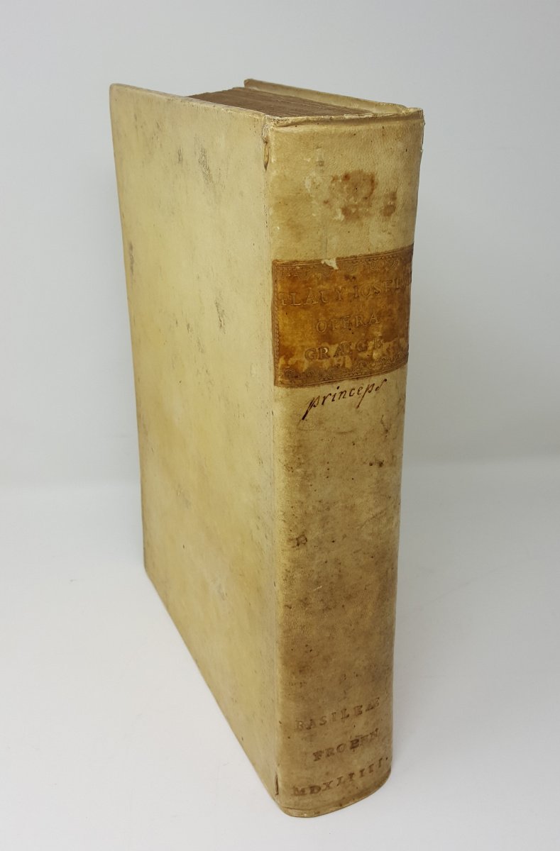 >in-folio (332x220 mm), pp. (12), 967, (1), bella legatura secentesca in pergamena, titolo su tassello al dorso, in astuccio in tela. Frontesp. a stampa rossa e nera, impresa tipogr. di Froben in rosso, testatine e grandi iniziali. silogr. Prefazione in latino di Arnoldus Peraxylus Arlenius, editore dell'opera (''in Fl. Iosephi opera, & historiae utilitatem''), al nobile spagnolo Diego Hurtado Mendoza, ambasciatore di Carlo V a Venezia, antico possessore del manoscritto, sul quale è basata la presente edizione. Editio princeps dell'opera omnia dello scrittore ebraico del I secolo d.C., comprendente le "Antiquitates iudaicae", la storia degli Ebrei in 20 libri, il "De bello judaico", 7 libri sulla conquista della Galilea da parte di Vespasiano ed il "De antiquitate Judaeorum contra Appionem", apologia degli Ebrei contro un libello antigiudaico scritto dal maestro Alessandrino Apione. Affascinante volume, interamente impresso in greco con somma eleganza e chiarezza. "The editio principes of Josephus... was in fact an edition of his works in Latin, still the intellectual language of Europe in 1470; the first edition of the Greek text did not appear in print until nearly 75 years later, after the Renaissance revival of Greek learning". Bell'esempl. su carta forte, a grandi margini. Al contropiatto nota di inizio XIX secolo del libraio G.B. Petrucci Piancastelli a Palazzo Ruspoli, nota di possesso dell'epoca in greco, qualche fioritura più fitta in pochi fogli, forellino all'ultimo f. Dibdin II, 130:"This volume is beautiful and rare". BMC, German, 463. Adams J-351. Hoffman II, 443.